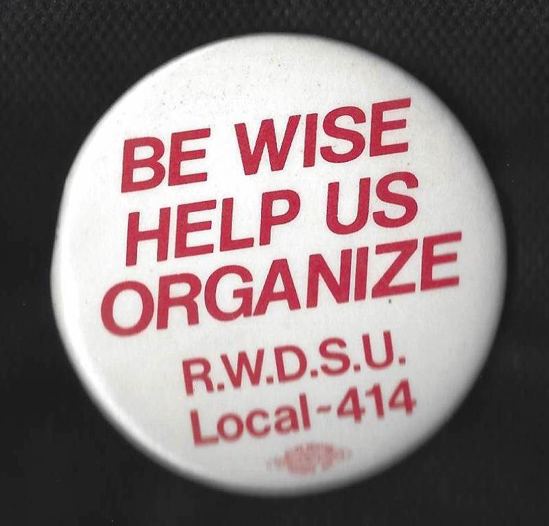 Be Wise, Help Us Organize This white button has the slogan “Be Wise – Help Us Organize R.W.D.S.U Local ~ 414” in red block lettering. It was made in 1988 in support of the unionization drive by Retail, Wholesale and Department Store Union (RWDSU) Area Local 414. This effort was one of a number of similar attempts during this period to unionize workers in the retail and service sectors where the workforce was predominantly female. Metadata Title: Be Wise, Help Us Organize Date: 1988 Region: Ontario City/Town: Milton