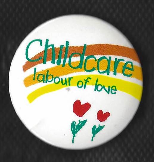 Childcare Labour of Love Created by the Ontario Coalition for Better Child Care in 1996, this white button advocates for early childhood care and education in Ontario. It shows the slogan, “Childcare Labour of Love” in green writing set against three stripes in rust, orange, and yellow with two heart-shaped flowers along the bottom. Metadata Title: Childcare Labour of Love Date: 1996 Region: Ontario Artist: Ontario Coalition for Better Child Care