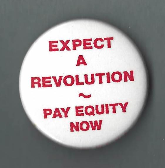 Expect a Revolution: Pay Equity Now A 1989 button from Vancouver with a white background and the slogan “Expect A Revolution ~ Pay Equity Now” written in bold red. Metadata Title: Expect a Revolution: Pay Equity Now Date: 1989 Region: British Columbia City/Town: Vancouver