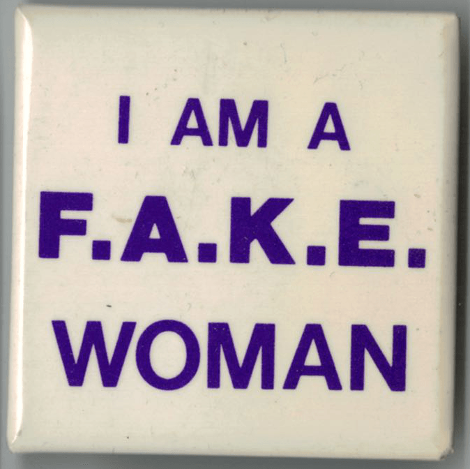 I am a F.A.K.E. Woman This button with the slogan “I am a F.A.K.E. Woman” was created in the mid 1980s by a group of university students in response to remarks by Gwendolyn Landolt, speaking on behalf of REAL Women, a conservative group against feminism and gay rights. The letters stand for “Feminists for All Kinds of Equality.” Metadata Title: I am a F.A.K.E. Woman