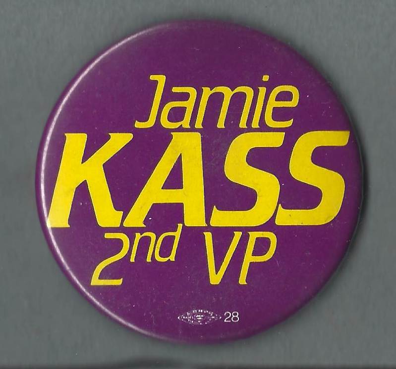 Jamie KASS 2nd Vice President This purple button has the slogan “Jamie KASS 2nd VP” in yellow lettering. It was used for the election campaign of Jamie Kass, a feminist and child care/labour activist. Kass was running for the position of 2nd Vice President at the 1986 Canadian Union of Public Employees (CUPE) Ontario Convention. Metadata Title: Jamie KASS 2nd Vice President Date: 1986 Region: Ontario