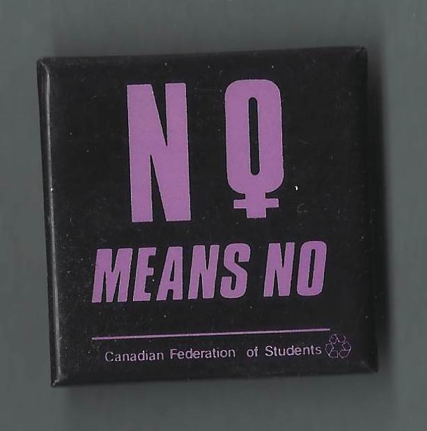No Means No This square black button was created in the 1980s by the Canadian Federation of Students as part of a CFS campaign on university campuses against sexual violence against women. The slogan “No Means No” is written in purple lettering, with the O on the first “No” being the female symbol. Below the slogan are the words “Canadian Federation of Students”. Metadata Title: No Means No Region: National (all of Canada)