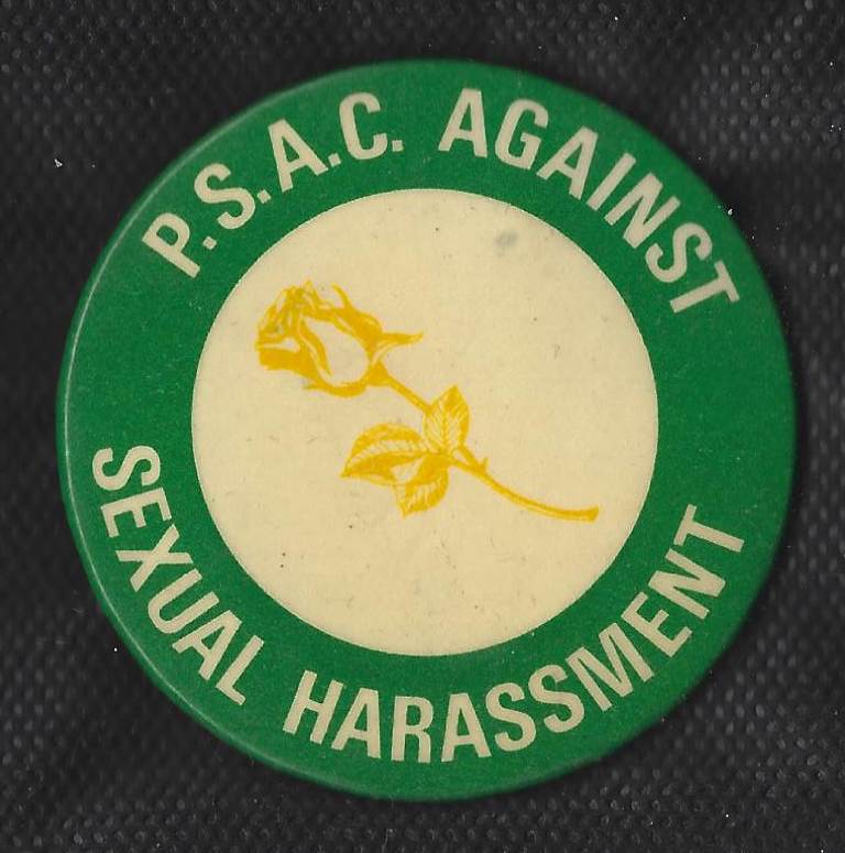 P.S.A.C. Against Sexual Harassment This 1984 button was produced as part of a campaign against sexual harassment organized by the Public Service Alliance of Canada (PSAC). The button features a yellow rose—an image historically used by feminist and labour movements—set against a cream background, with a green outer ring and bold white text reading “P.S.A.C. AGAINST SEXUAL HARASSMENT.” Metadata Title: P.S.A.C. Against Sexual Harassment Date: 1988 Region: National (all of Canada) Artist: Public Service Alliance of Canada (PSAC)