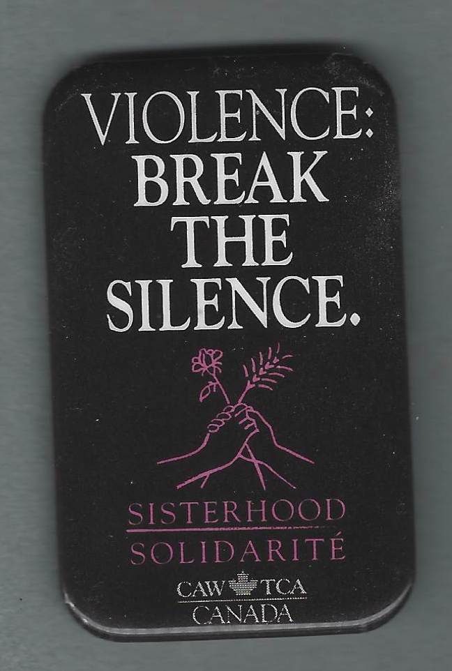 Violence: Break the Silence – Sisterhood Solidarité CAW/TCA Canada This 1991 button displays the slogan “Violence: Break the Silence,” and an illustration of hands clasped together with “Sisterhood/Solidarite” below. It was created by the Canadian Auto Workers (CAW/TCA) to support speaking up against violence against women. Metadata Title: Violence: Break the Silence – Sisterhood Solidarité CAW/TCA Canada Date: 1991 Region: National (all of Canada)