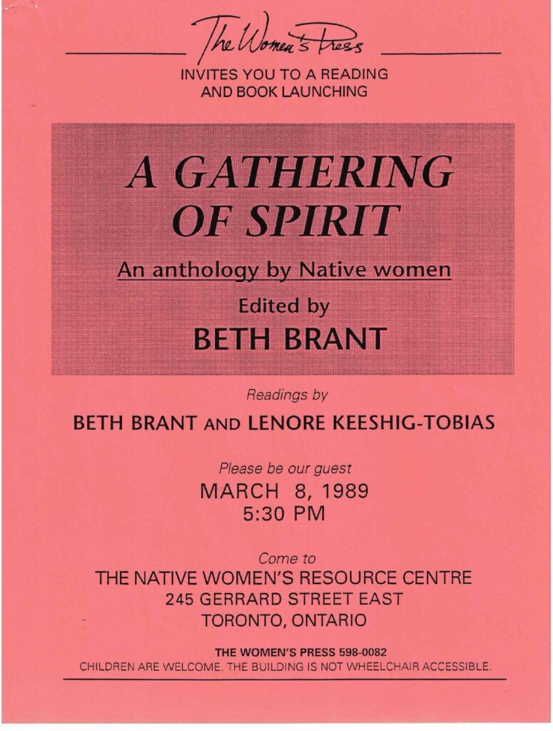 A Gathering of Spirit: Book Launch and Reading This flyer invites readers to a launch party of “A Gathering of Spirit: An Anthology by Native Women”. The event, hosted by The Women’s Press at the Native Women’s Resource Centre in Toronto on March 8, 1989, features readings by Beth Brant and Lenore Keeshig-Tobias. “A Gathering of Spirit: An Anthology by Native Women”, edited by Beth Brant, was the first published collection of Indigenous women’s writing in North America and was republished in 1989 by Women’s Press. Metadata Title: A Gathering of Spirit: Book Launch and Reading Date: 1989 Publisher: The Women’s Press Region: Ontario City/Town: Toronto