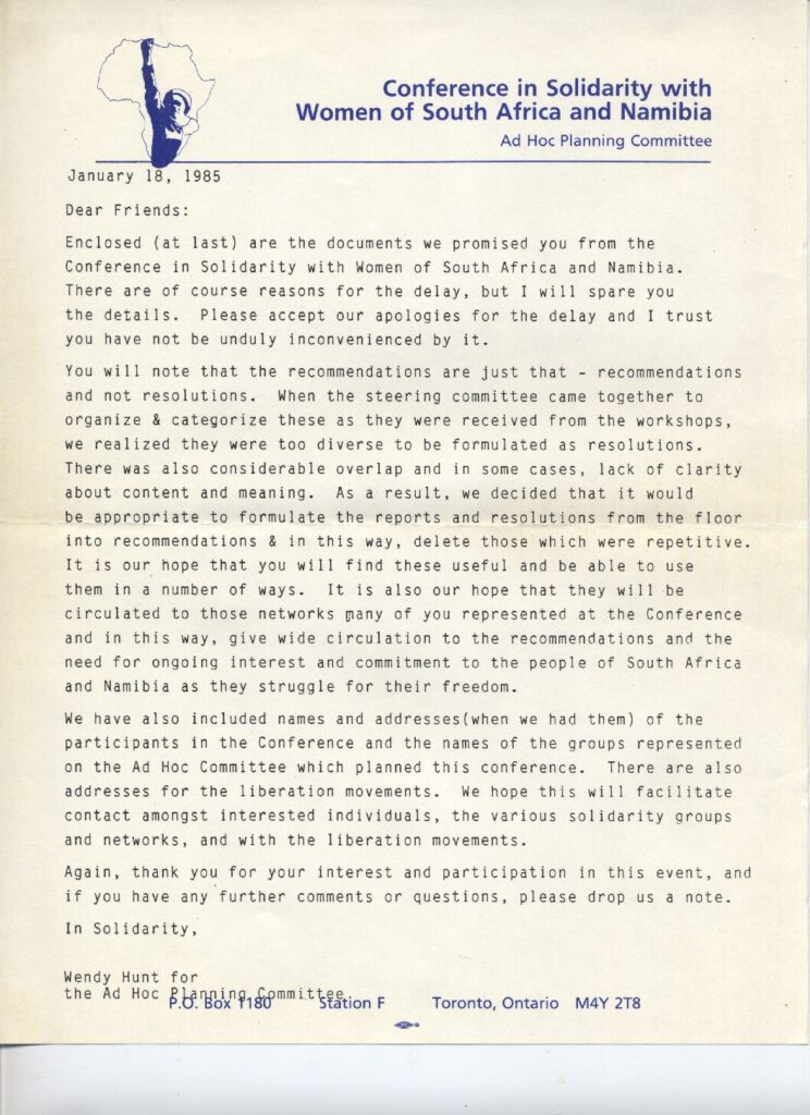 Conference in Solidarity with Women of South Africa and Namibia – Participants List This document, prepared by Wendy Hunt, includes a list of names and addresses of participants of the 1984 Conference in Solidarity with Women of South Africa and Namibia in Toronto. The list was shared to facilitate connection among interested individuals, solidarity groups, internationalist networks, and liberation movements. Metadata Title: Conference in Solidarity with Women of South Africa and Namibia – Participants List Date: 1984 Region: Ontario City/Town: Toronto Author(s): Wendy Hunt