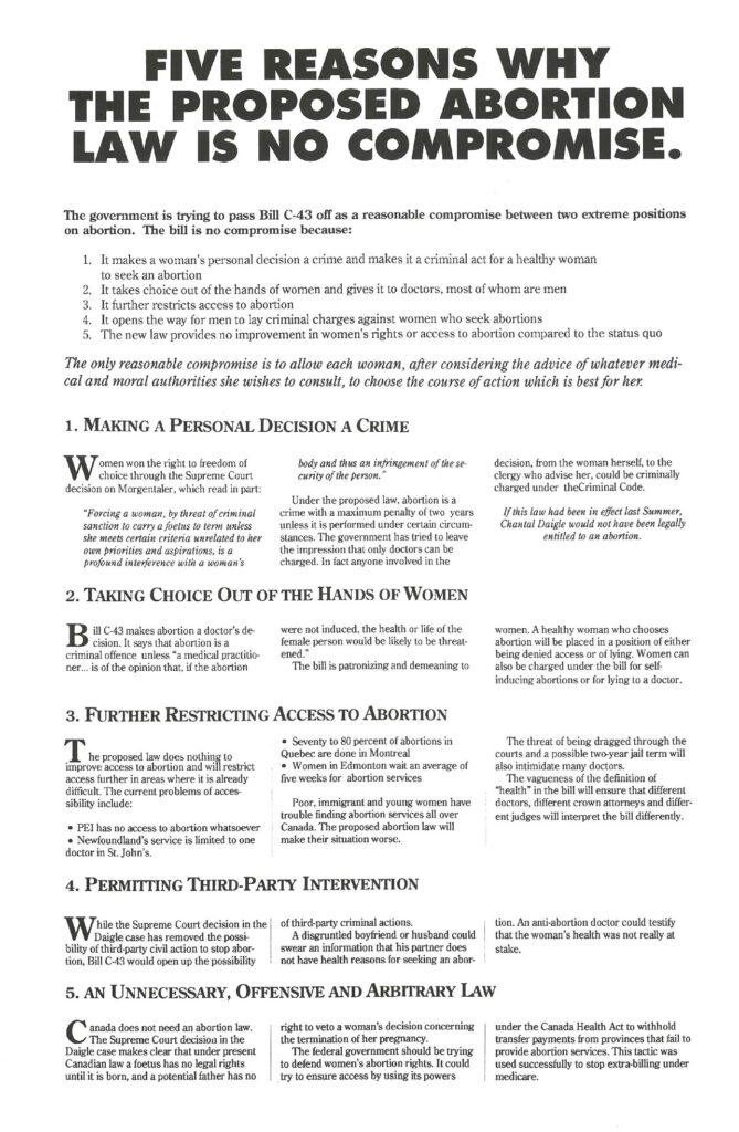 Five Reasons Why the Proposed Abortion Law is No Compromise This 1989 document by Men for Women’s Choice was created in response to Bill C-43. brought forward by the Conservative government led by Brian Mulroney. It addresses the reasons why the proposed abortion law is not a compromise and why men should oppose it. It includes a copy of an statement published in Globe and Mail and listing supporters, as well as a call for men to show their support for a woman’s right to choose by contacting federal government leaders and their Member of Parliament. Metadata Title: Five Reasons Why the Proposed Abortion Law is No Compromise Date: 1989 Publisher: Men for Women's Choice Region: National (all of Canada)