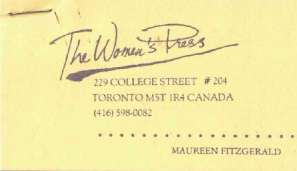 The Women’s Press – Maureen Fitzgerald (Business Card) This yellow business card has The Women’s Press logo and address at the centre of the card, with the name of Maureen Fitzgerald at the bottom right. Fitzgerald was a managing editor of Women’s Press during the 1980s and an advocate for the inclusion of lesbian-centred writing. Metadata Title: The Women’s Press – Maureen Fitzgerald (Business Card) Region: National (all of Canada) City/Town: Toronto