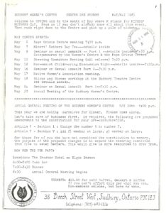 The Sudbury Women’s Centre opened January 1st, 1981. Its Constitution encapsulates the aims and purposes of the Sudbury Women’s Liberation Movement: