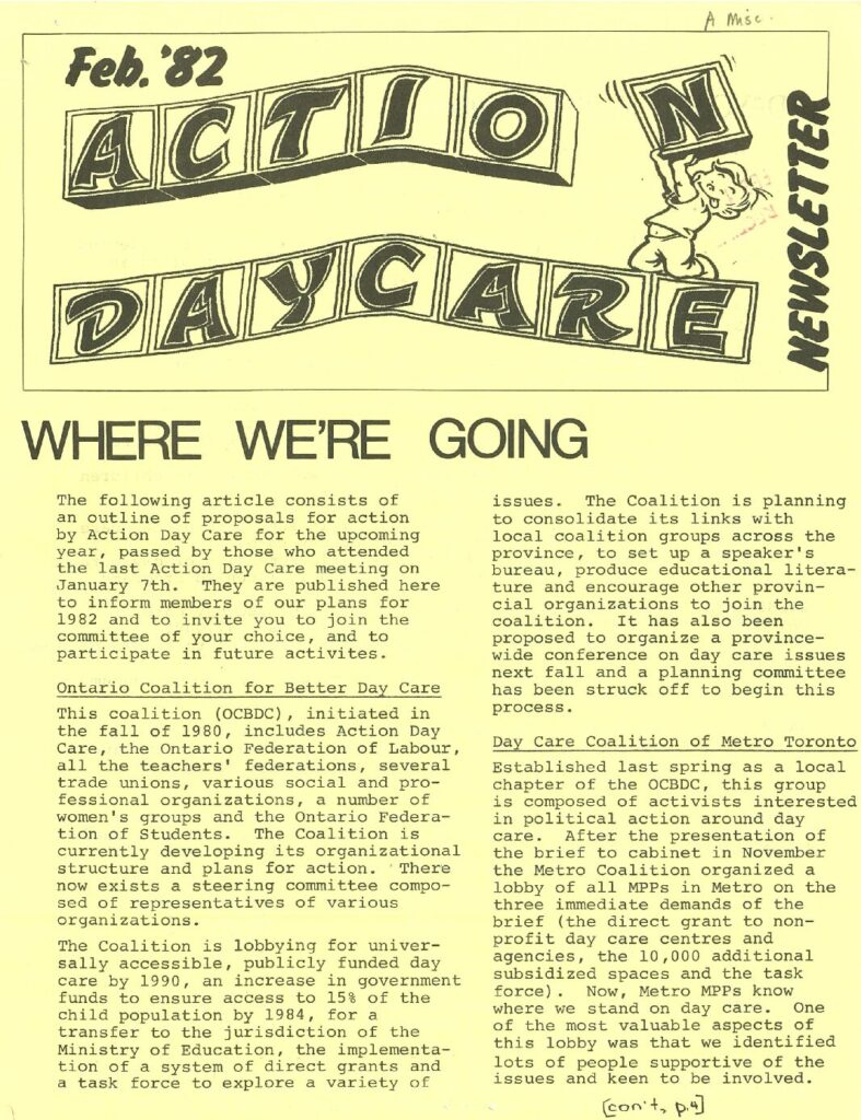 Action Day Care Newsletter – February 1982 Topics include: Action Day Care Action Plan, including updates on Ontario Coalition for Better Day Care, Day Care Coalition of Metro Toronto, Unionizing Support Committee, and a Federal Strategy Daycare in Canada: Facts Sole Support Mother’s Group Action Day Care Updates Upcoming Events Metadata Title: Action Day Care Newsletter – February 1982 Date: February 1982 Publisher: Action Day Care Region: Ontario