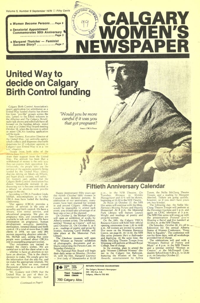 Calgary Women’s Newspaper – Volume 5, Number 9 – September 1979 Topics include: Calgary Birth Control Association (CBCA) Funding Persons Day Anniversary Celebrations Reflections on the Women’s Movement History of Persons Case Pornography Legislation National Action Committee on Status of Women (NAC) Updates Alberta Status of Women Action Committee (ASWAC) Updates Senate Appointment: Martha Bielish International News, including: Domestic Violence Legislation in Ireland, Feminist Literature, Reproductive Rights Margaret Thatcher Nellie McClung: Quotes Book Review: The Hard Way Up YWCA Women’s Resource Centre Gay and Lesbian Organizing Film Review: The Deerhunter Letters Events Metadata Title: Calgary Women’s Newspaper – Volume 5, Number 9 – September 1979 Date: September 1979 Publisher: Calgary Status of Women Action Committee (CSWAC) Region: Alberta City/Town: Calgary Author(s): Halyna Freeland, Beebo Brinker, Pat Preston, Gunilla Mungan, Natalie Chomiak, Kathryn C. Toane, Norma F. Bicknell