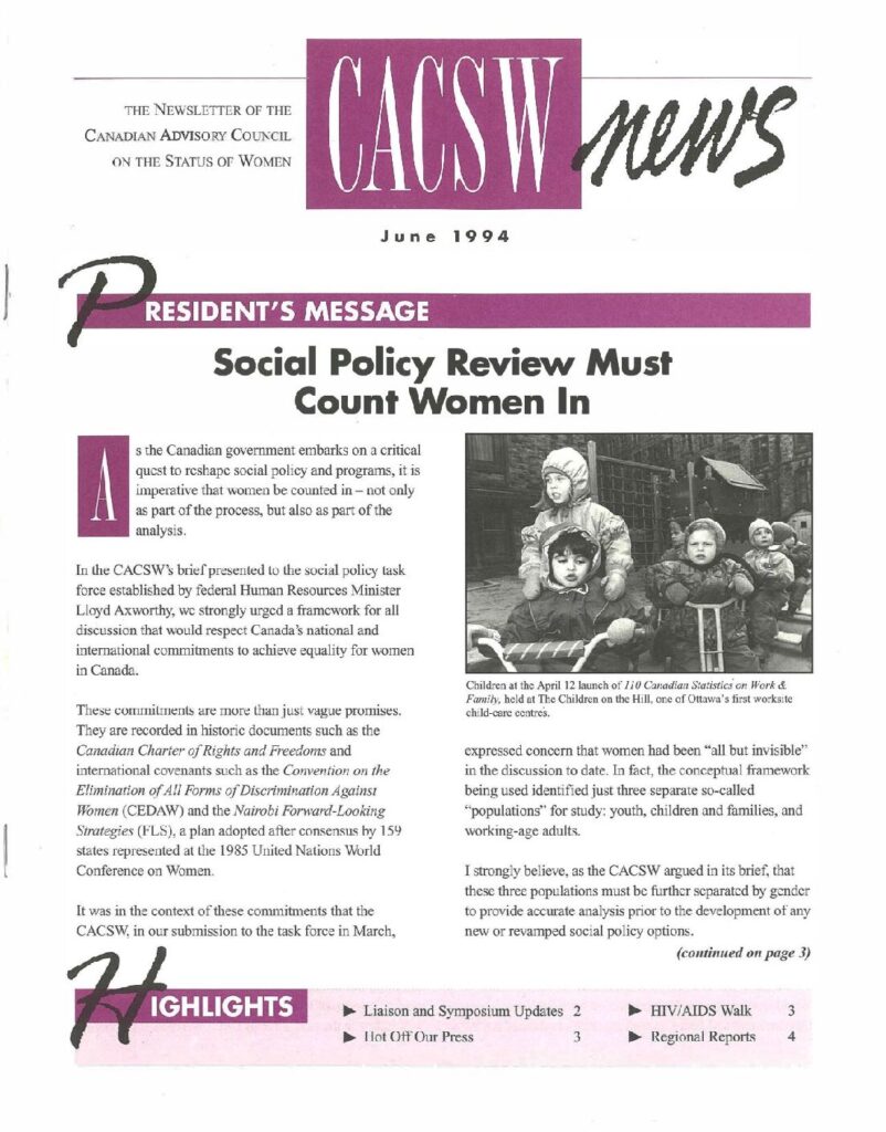 Canadian Advisory Council on the Status of Women Newsletter – June 1994 Topics include: President’s Message – Social Policy Review Community Liaison Research Updates Health Symposium Updates HIV/AIDS Walk for Women and Children In Memoriam – Debra Dungey Book – Work In Progress: Tracking Women’s Equality in Canada Attack at College of New Caledonia Take Our Daughters to Work Project Sujets incluent : Message de la présidente – l’examen de la politique sociale Nouvelles de la liaison et du colloque Marche de solidarité avec les femmes séropositives et sidéennes avec le VIH/SIDA, ainsi que leurs enfants, En mémoire de Debra Dungey Livre – Une dossière en évolution L’attaque au College of New Caledonia Projet « Amenons nos filles au travail » Metadata Title: Canadian Advisory Council on the Status of Women Newsletter – June 1994 Date: June 1994 Publisher: Canadian Advisory Council on the Status of Women Region: National (all of Canada)