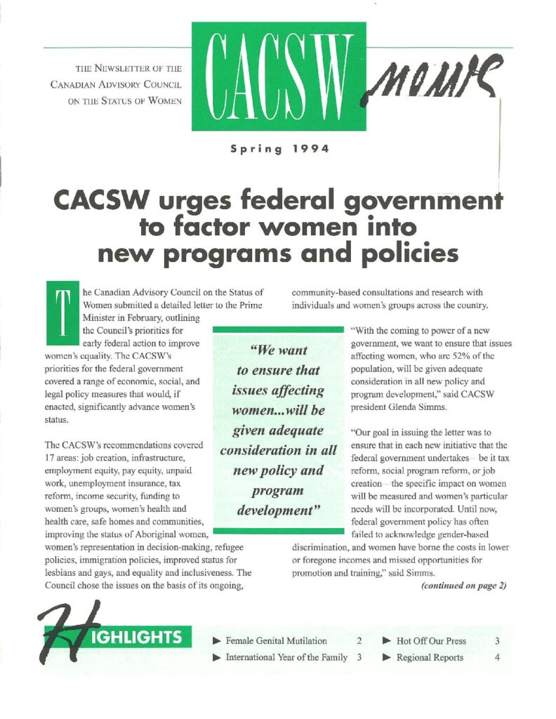 Canadian Advisory Council on the Status of Women Newsletter – Spring 1994 Topics include: Federal Recommendations for Women’s Equality Female Genital Mutilation International Year of the Family Compendium – 110 Canadian Statistics on Work & Family Child Custody and Access Policy In Memoriam Pre-Budget Conference Zero Tolerance of Violence Declaration Take Our Daughters to Work Project Les sujets incluent: Les recommandations fédérales pour l’équité des femmes La mutilation des organes génitaux des femmes L’année internationale de la famille Ouvrage – 110 Statistiques sur le travail et la famille au Canada Politique sur la garde d’enfants et le droit de visite En mémoire de… Helen Hnatyshy et Grace Hartman La conférence prébudgétaire Déclaration d’intolérance à la violence Projet « Amenons nos filles au travail » Metadata Title: Canadian Advisory Council on the Status of Women Newsletter – Spring 1994 Date: Spring 1994 Publisher: Canadian Advisory Council on the Status of Women Region: National (all of Canada)