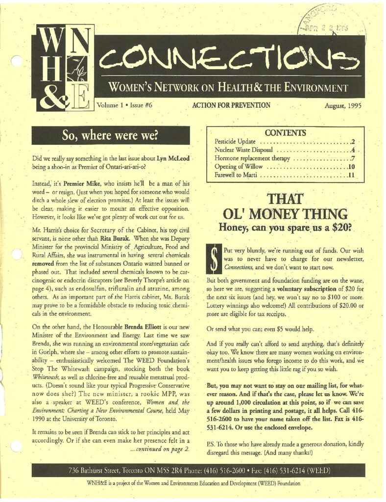 Connections: Women’s Network on Health & the Environment – Vol 1, Issue 6 – August 1995 Topics include: Call To Action- Pesticide Update Backgrounder- Nuclear Waste Disposal Research – Hormone Replacement Therapy New Breast Cancer Centre – Opening of Willow Farewell to Marti Insert: Rachel’s Environment & Health Weekly, #454 – Milk Safety Metadata Title: Connections: Women’s Network on Health & the Environment – Vol 1, Issue 6 – August 1995 Date: August 1995 Publisher: Women’s Network on Health & The Environment Region: National (all of Canada) Author(s): Andrea Ritchie, Jennifer Lawrence, Beverley Thorpe, Maureen Press-Merkur, Theressa Puchta