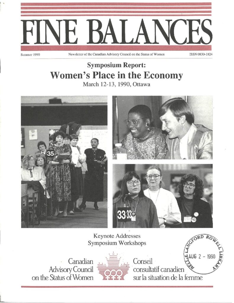 Fine Balances: Newsletter of the Canadian Advisory Council on the Status of Women/Un just équilibre: Bulletin du Conseil consultatif canadien sur la situation de la femme – Summer 1990 Theme: Women’s Place in the Economy Subjects include: CACSW President and Vice-President Nominations Keynote Addresses: Making Women’s Work Count, the Quebec Nurses’ Strike, Federal Initiatives for Current Economic Conditions, and Women and the Economy List of Resource Persons Symposium Workshops: Federal Tax Policy, Economic Realities of Motherhood, Poverty and Women, Pay Equity, Employment Equity, Valuing Unpaid Work Done by Women, Work and Jobs in the Future, Canadian Trade Policies, Alternative Economic Models, Sustainable Development, Building Coalitions, Negotiating, Reaching Young Women, Lobbying, and Fundraising Thème: La place des femmes dans l’économie Sujets incluent: Nominations du Président et du Vice-Président Discours-Programmes: Le travail des femmes, ça compte, La grève des infirmières du Québec, Initiatives fédérales visant la conjoncture économique, et La place des femmes dans l’économie Liste des Personnes-Ressources Ateliers: La fiscalité, Les réalités pécuniaires de la maternité, Les femmes et la pauvreté, L’équité salariale, L’équité en matière d’emploi, Valoriser le travail non rémunéré des femmes, Perspectives de travail et d’emploi, Pratiques commerciales du Canada, Solutions de rechange aux modèles économiques actuels, Le développement durable 16 Comment former une coalition, La négociation, Comment atteindre les jeunes filles 19 Le lobbying, et La collecte de fonds Metadata Title: Fine Balances: Newsletter of the Canadian Advisory Council on the Status of Women/Un just équilibre: Bulletin du Conseil consultatif canadien sur la situation de la femme – Summer 1990 Date: Summer 1990 Publisher: Canadian Advisory Council on the Status of Women Region: National (all of Canada) Author(s): Marylin Waring, Diane Lavalée, Mary Collins, Glenda P. Simms