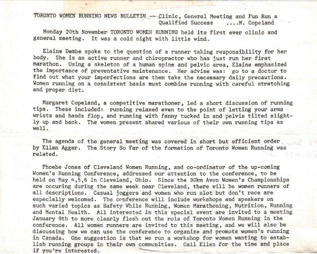 Toronto Women Running News Bulletin Topics include: Importance of Preventative Body Maintenance Running Tips Report on General Meeting Women’s Running Conference in Cleveland Volunteer Needs Financial Report Toronto Women Running Fun Run Metadata Title: Toronto Women Running News Bulletin Date: Autumn 1978 Publisher: Toronto Women Running Region: Ontario City/Town: Toronto Author(s): M. Copeland