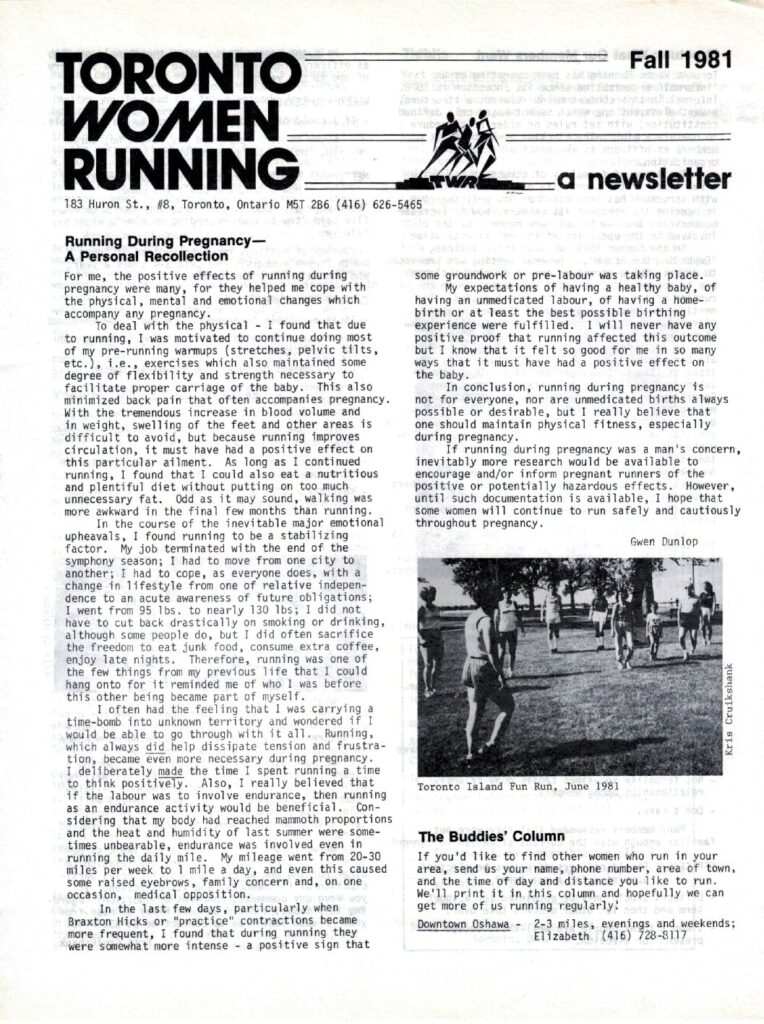 Toronto Women Running Newsletter – Fall 1981 Topics include: Running During Pregnancy Structure of Toronto Women Running Wilderness Expedition Yoga and Body Stress Upcoming Races Metadata Title: Toronto Women Running Newsletter – Fall 1981 Date: 1981 Publisher: Toronto Women Running Region: Ontario City/Town: Toronto Author(s): Gwen Dunlop, Kris Cruikshank, Sally Kerr, Marlene Mawhinney