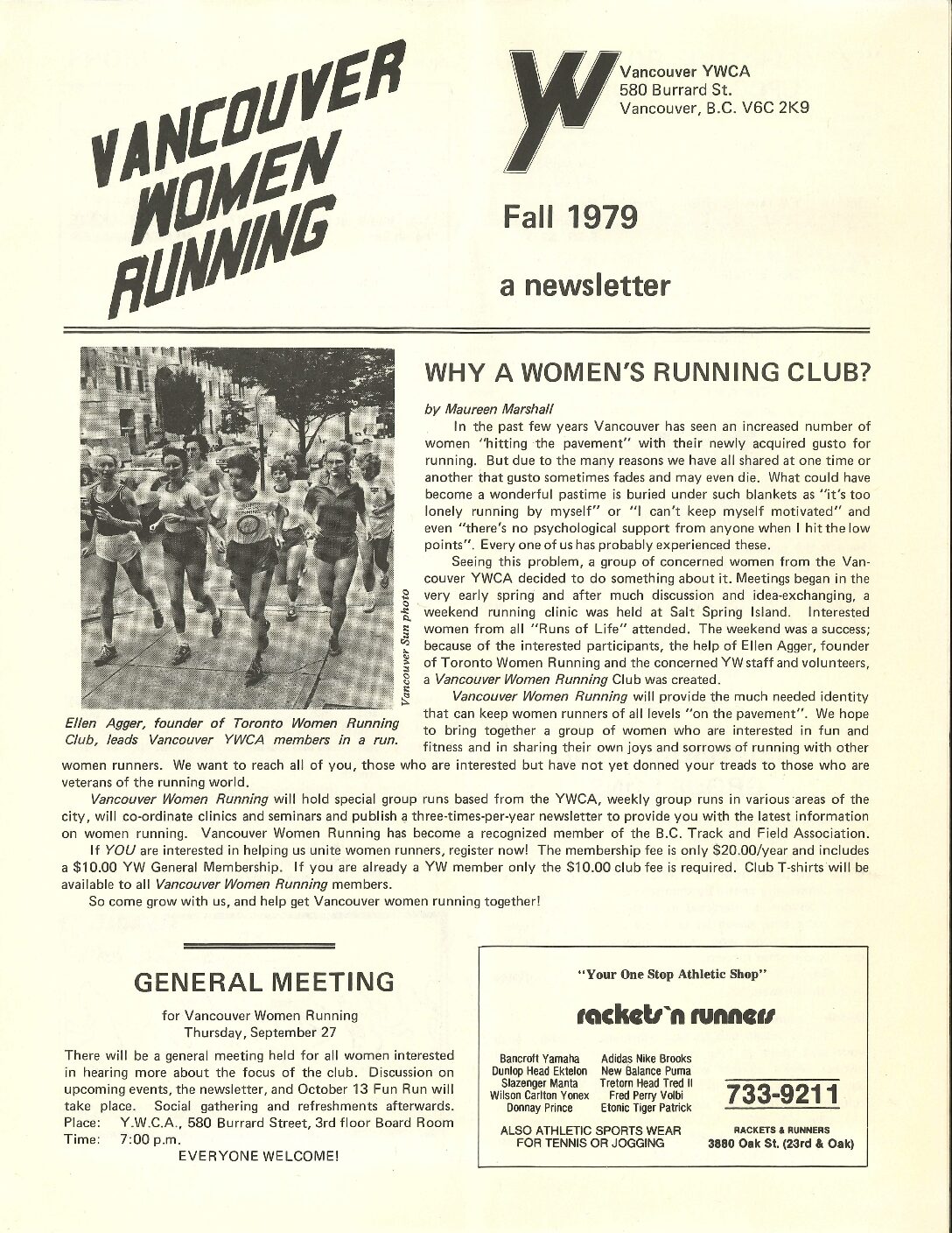 Vancouver Women Running was organized in 1979 following a spring weekend running clinic organized by women from the Vancouver YWCA and supported by Ellen Agger, founder of Toronto Women Running. The goal was to bring together women interested in fun and fitness through running and provide support to runners at all levels. The newsletter was published three times a year to provide information on women’s running.