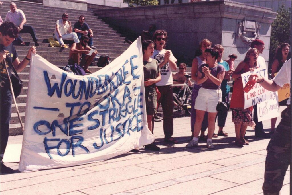 IWD Wounded Knee to Oka This photo from the 1992 International Women’s Day march features women and supporters holding a banner that reads: “Wounded Knee to Oka: One Struggle for Justice.” Metadata Title: IWD Wounded Knee to Oka Date: 1992 Photographer: Diana Meredith