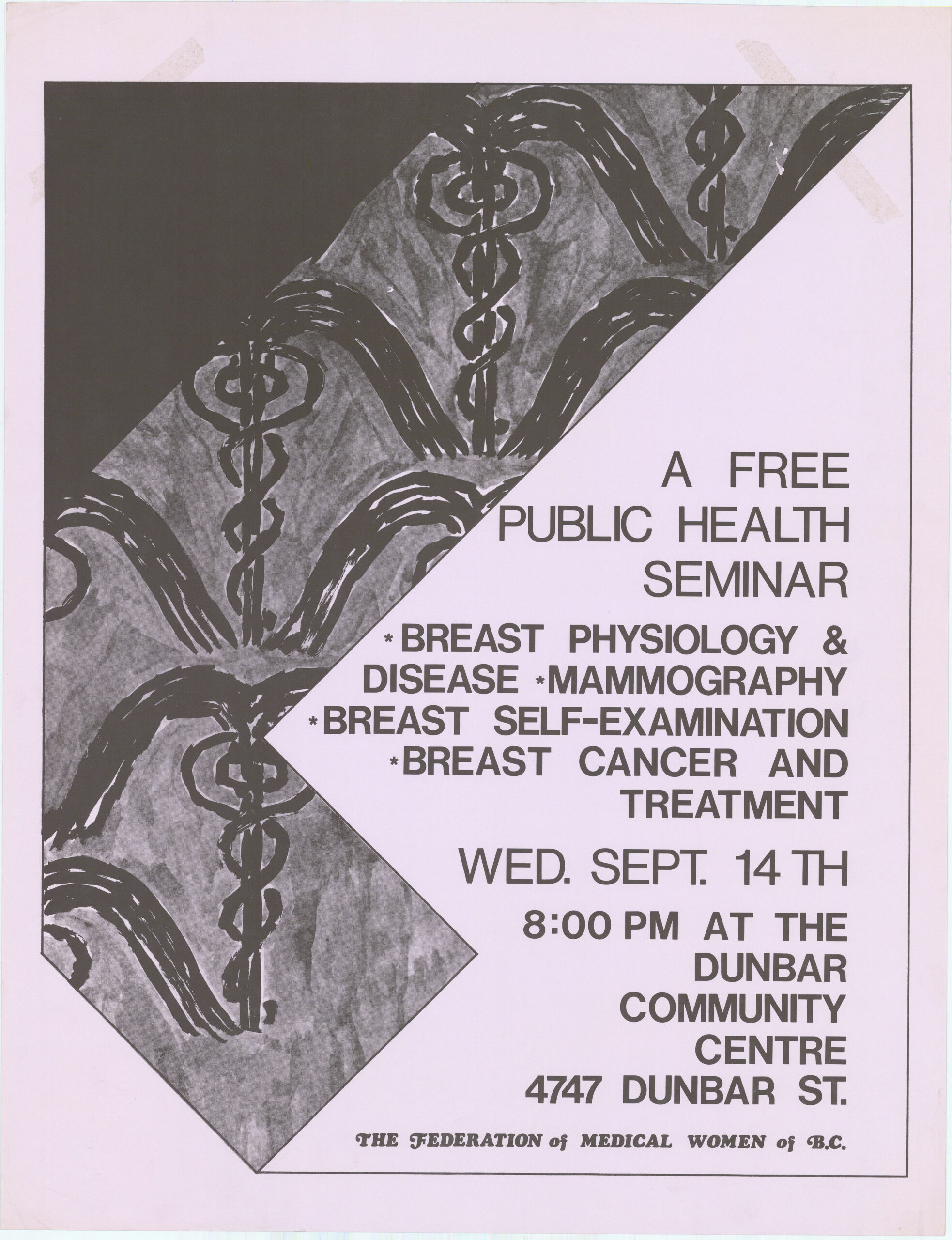 A Free Public Health Seminar: Breast Health Undated poster promoting a free Public Health Seminar, hosted by the Federation of Medical Women of B.C. at the Dunbar Community Centre. Topics included breast physiology & disease, mammography, breast self-examination and breast cancer treatment. This material is reproduced here with the permission of Press Gang, a feminist printing and publishing collective active in Vancouver from the early 1970s to 2002. Posters by Press Gang are held at the Simon Fraser University Archives. Metadata Title: A Free Public Health Seminar: Breast Health Region: British Columbia City/Town: Vancouver