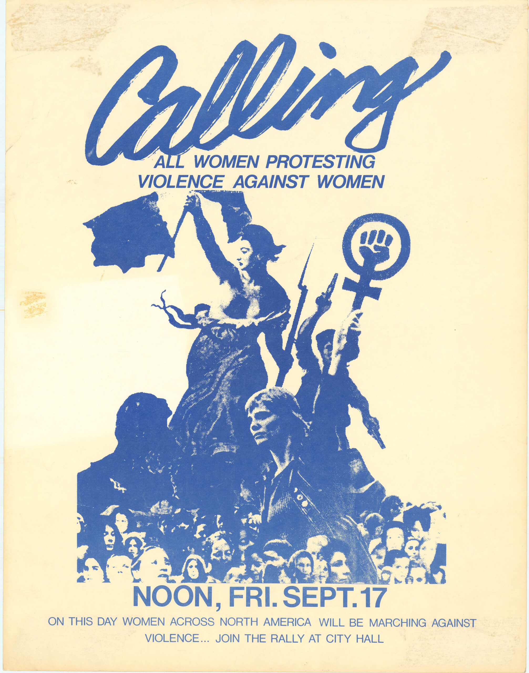 Calling All Women Protesting Violence Against Women This undated poster promotes a rally at city hall protesting violence against women, emphasizing that women across North America would be marching in solidarity. This material is reproduced here with the permission of Press Gang, a feminist printing and publishing collective active in Vancouver from the early 1970s to 2002. Posters by Press Gang are held at the Simon Fraser University Archives. Metadata Title: Calling All Women Protesting Violence Against Women Region: British Columbia City/Town: Vancouver