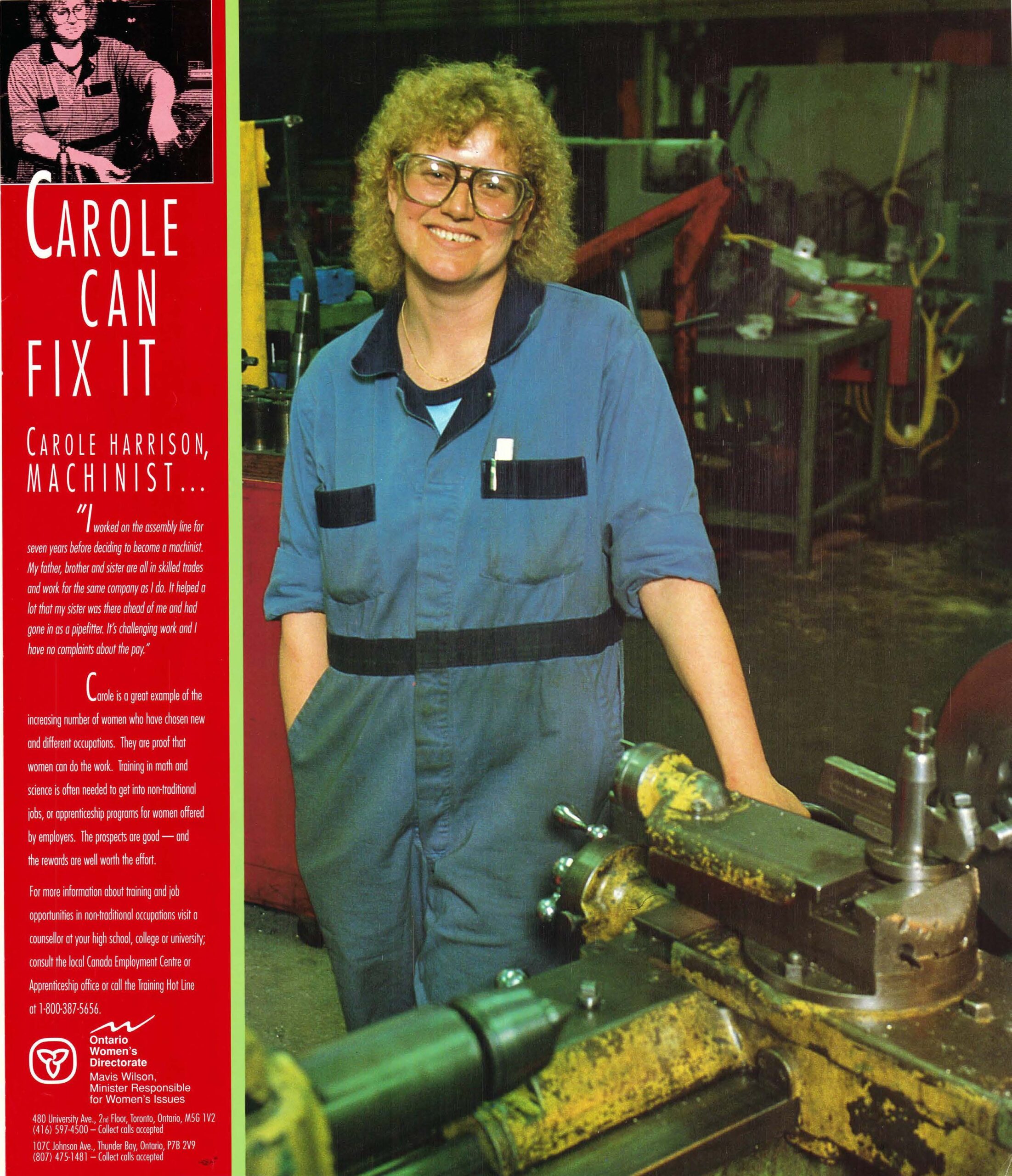 Carole Can Fix It This poster was created in the early 1990s for the Ontario Women’s Directorate as part of its “Job Opportunities for Women” campaign, which promoted women’s participation in non-traditional occupations. It highlights Carole Harrison who joined the skilled trades as a machinist. The design features a column of white text on a red background, paired with a photo of Carole at her work station in a factory assembly line. Graphic design is by Joss Maclennan. The poster is one of a number in the Rise Up archival collection by Joss Maclennan. Copyright is held by the artist and the poster is shared here with Joss Maclennan’s permission. Metadata Title: Carole Can Fix It Region: Ontario Artist: Joss Maclennan