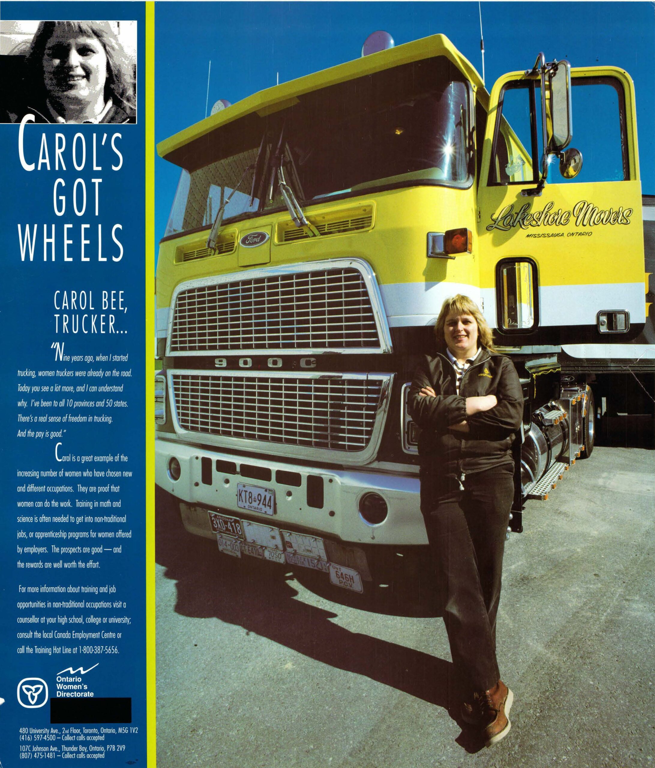 Carol’s Got Wheels This poster was created in the early 1990s for the Ontario Women’s Directorate as part of its “Job Opportunities for Women” campaign, which promoted women’s participation in non-traditional occupations. The poster highlights Carol Bee, a trucker, and the design features a column of white text on a navy background, paired with a photo of Carol and her truck. Graphic design is by Joss Maclennan. The poster is one of a number in the Rise Up archival collection by Joss Maclennan. Copyright is held by the artist and the poster is shared here with Joss Maclennan’s permission. Metadata Title: Carol’s Got Wheels Region: Ontario Artist: Joss Maclennan