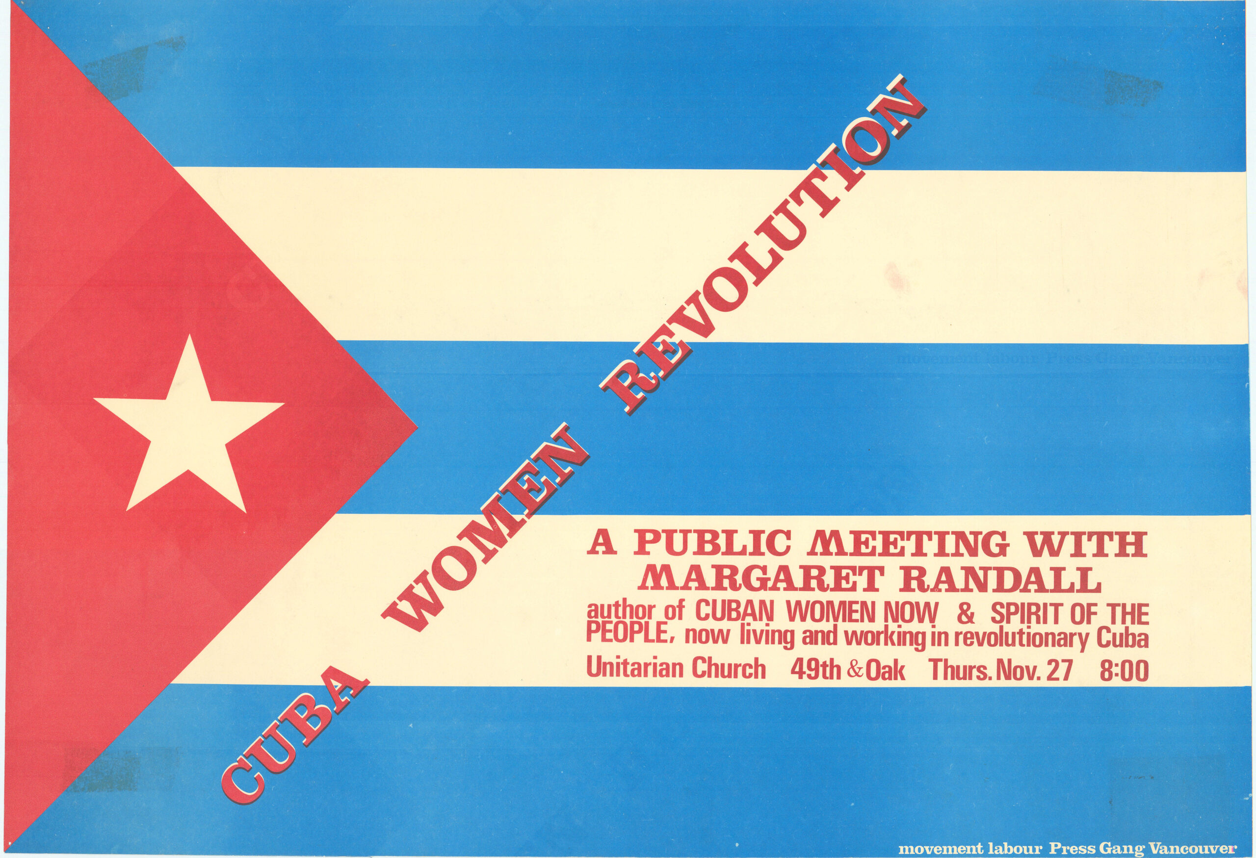 Cuba Women Revolution Undated poster promoting a public meeting with Margaret Randall, author of Cuban Women Now and Spirit of the People, at the Unitarian Church on 49th and Oak in Vancouver. Randall is a poet, feminist, photographer, oral historian, and social activist from New York. At the time of the meeting, Randall lived and worked in revolutionary Cuba. This material is reproduced here with the permission of Press Gang, a feminist printing and publishing collective active in Vancouver from the early 1970s to 2002. Posters by Press Gang are held at the Simon Fraser University Archives. Metadata Title: Cuba Women Revolution Region: British Columbia City/Town: Vancouver