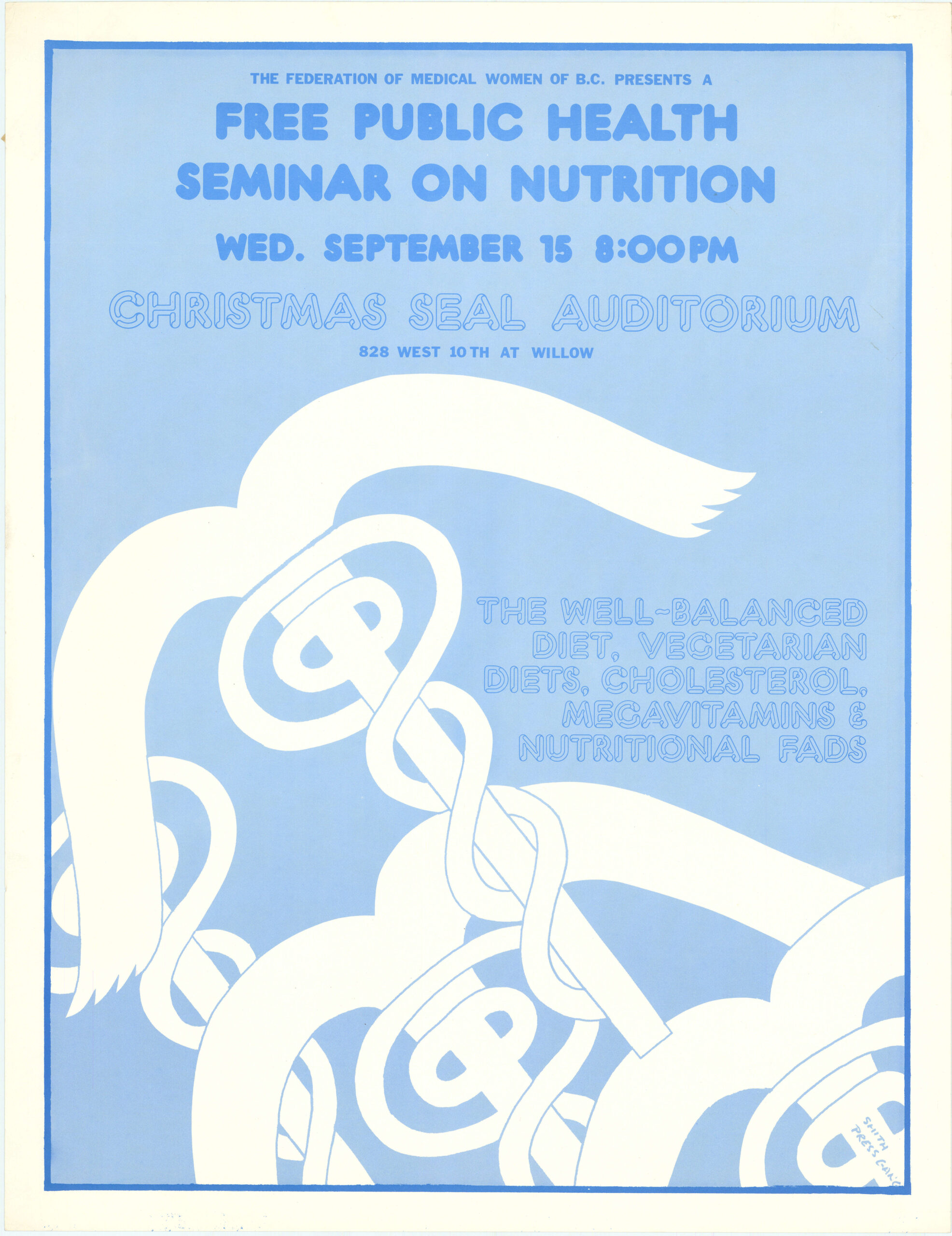 Free Public Health Seminar On Nutrition Undated poster promoting a free Public Health Seminar on Nutrition, hosted by the Federation of Medical Women of B.C. at the Christmas Seal Auditorium. Topics included the well-balanced diet, vegetarian diets, cholesterol, megavitamins and nutritional fads. This material is reproduced here with the permission of Press Gang, a feminist printing and publishing collective active in Vancouver from the early 1970s to 2002. Posters by Press Gang are held at the Simon Fraser University Archives. Metadata Title: Free Public Health Seminar On Nutrition Region: British Columbia City/Town: Vancouver