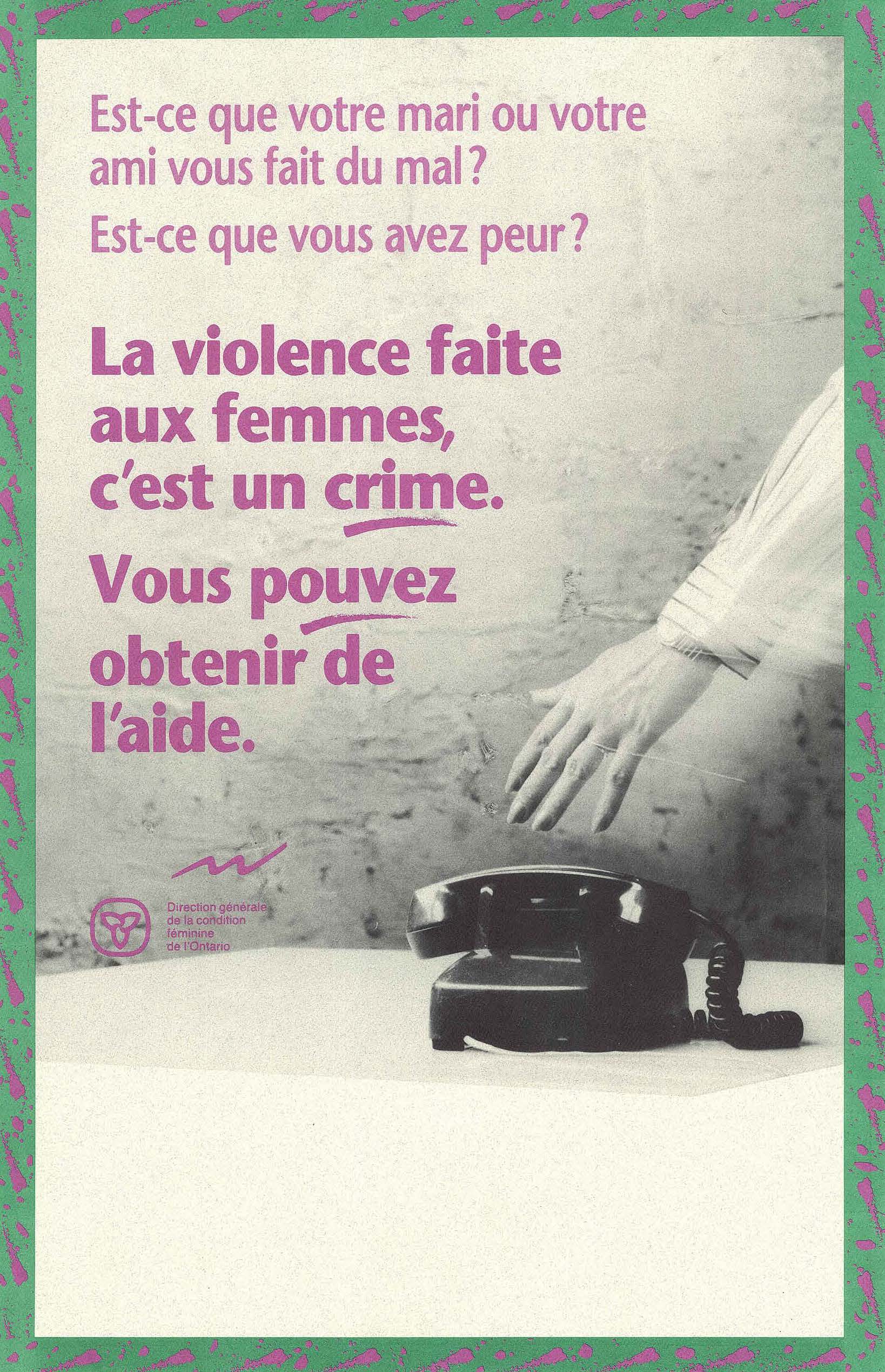 La violence faite aux femmes c’est un crime Cette affiche a été créée pour la Direction générale de la condition féminine de l’Ontario pendant les années 1990 comme un message d’intérêt public contre la violence conjugale. L’illustration représente une main qui est tendue vers un téléphone, avec le texte : « Est-ce que votre mari ou votre ami vous fait du mal? La violence faite aux femmes, c’est un crime. Vous pouvez obtenir l’aide » Au bas, il y a un logo pour la Direction générale de la condition féminine de l’Ontario. L’affiche a été conçue et illustrée par Joss Maclennan. Cette affiche fait partie de la collection d’archives Rise Up de Joss Maclennan. Les droits d’auteur appartiennent à l’artiste et l’affiche est partagée ici avec l’autorisation de Joss Maclennan. Metadata Title: La violence faite aux femmes c’est un crime Date: 1990 Region: Ontario Artist: Joss Maclennan