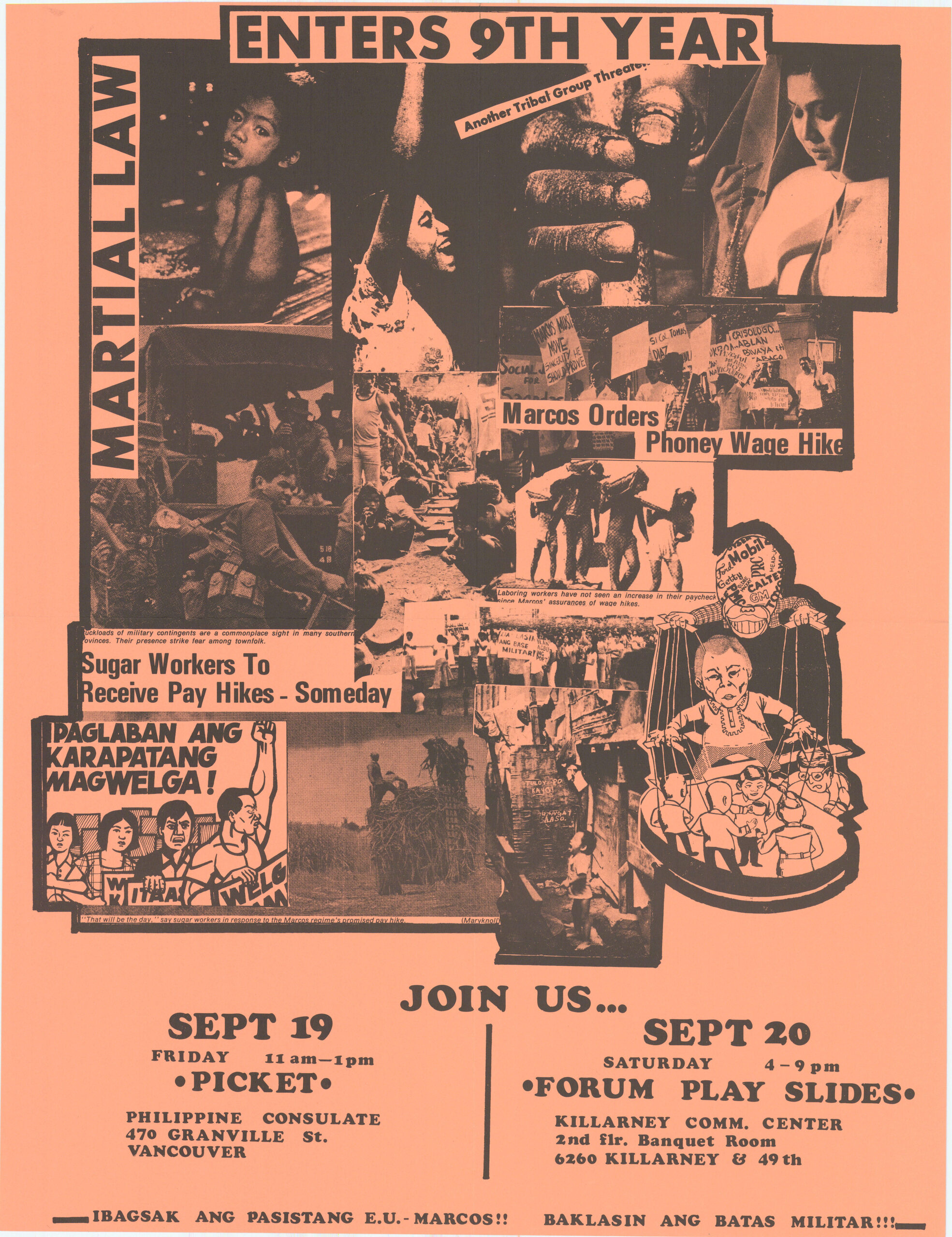 Martial Law Enters 9th Year This 1981 poster promotes two Vancouver rallies against the Filipino government’s use of martial law under president Ferdinand Marcos. This material is reproduced here with the permission of Press Gang, a feminist printing and publishing collective active in Vancouver from the early 1970s to 2002. Posters by Press Gang are held at the Simon Fraser University Archives. Metadata Title: Martial Law Enters 9th Year Date: 1981 Region: British Columbia City/Town: Vancouver Artist: Press Gang