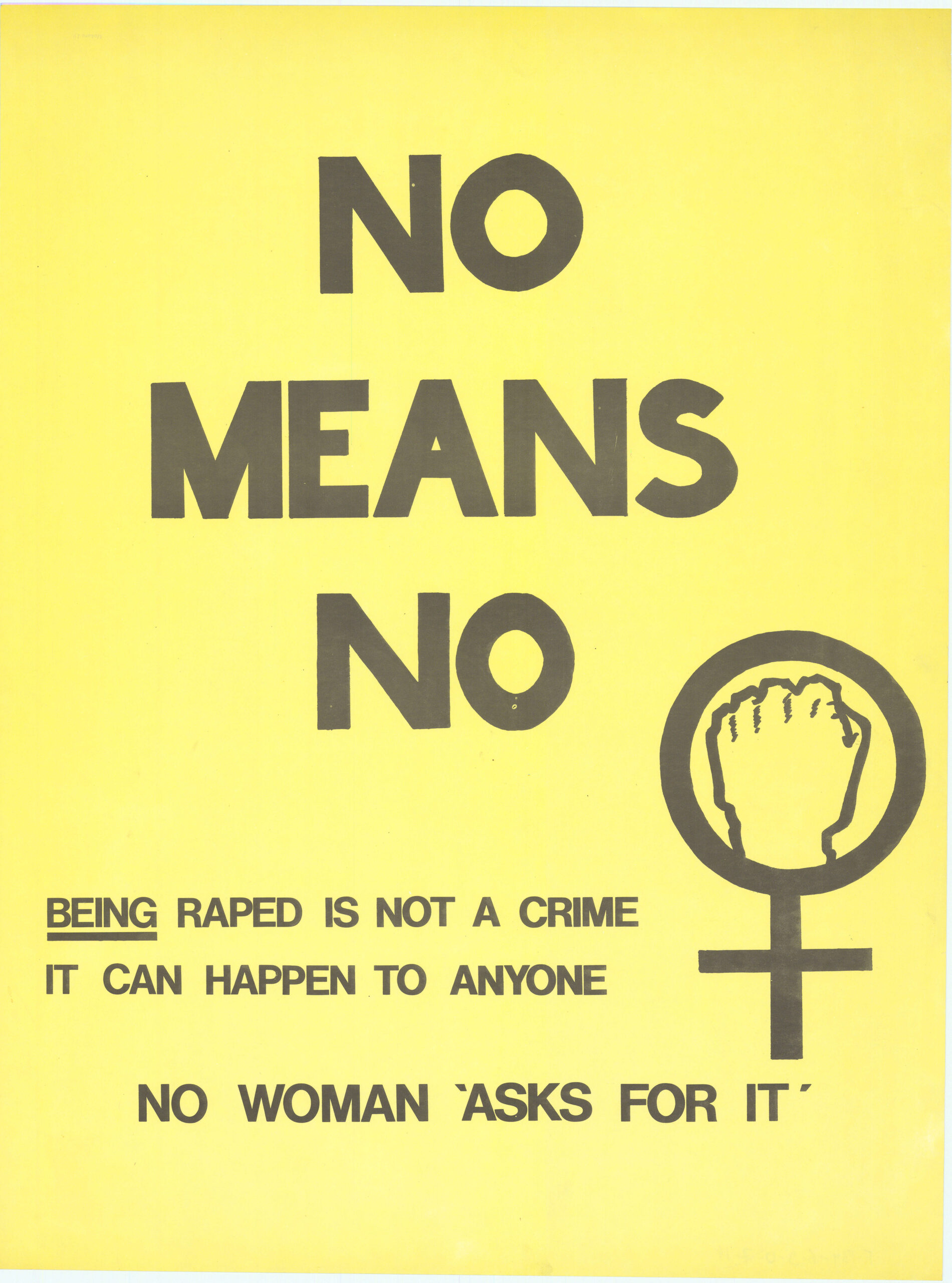 “NO MEANS NO” This undated poster printed by Press Gang has bold black text on a yellow background reading “NO MEANS NO.” Additional messages on the poster are “Being raped is not a crime — it can happen to anyone” and “No woman ‘asks for it.’” The poster features a raised fist inside the women’s symbol, emphasizing anti-rape advocacy and women’s rights. This material is reproduced here with the permission of Press Gang, a feminist printing and publishing collective active in Vancouver from the early 1970s to 2002. Posters by Press Gang are held at the Simon Fraser University Archives. Metadata Title: “NO MEANS NO” Region: British Columbia