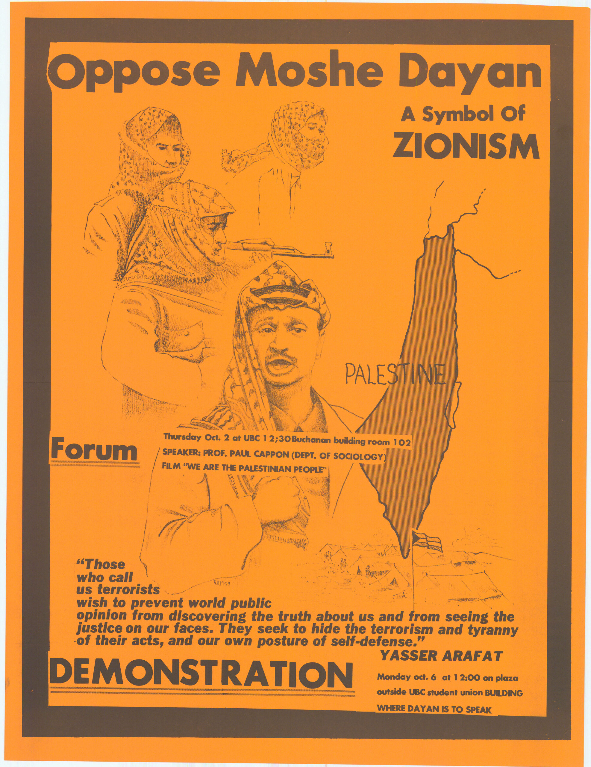 Oppose Moshe Dayan – A Symbol of Zionism This 1975 poster promotes a forum and demonstration held at the University of British Columbia in protest of a visit by former Israeli Defense Minister Moshe Dayan. At the centre of the poster is a drawing of Yasser Arafat, former president of the National Palestinian Authority, accompanied by one of his quotes, along with an image of a map of Palestine and the Palestinian flag. The forum included a screening of the film We Are the Palestinian People, and the demonstration took place at the UBC Student Union Building, where Dayan was scheduled to speak. It was organized by the ad-hoc Committee to Oppose Moshe Dayan’s Visit and included members of the Revolutionary Marxist Group, the Communist Party of Canada (Marxist-Leninist), the Young Socialists, members of the Gay People of UBC, and supporters of the Palestine Liberation Organization. This material is reproduced here with the permission of Press Gang, a feminist printing and publishing collective active in Vancouver from the early 1970s to 2002. Posters by Press Gang are held at the Simon Fraser University Archives. Metadata Title: Oppose Moshe Dayan – A Symbol of Zionism Date: 1975 Region: British Columbia City/Town: Vancouver