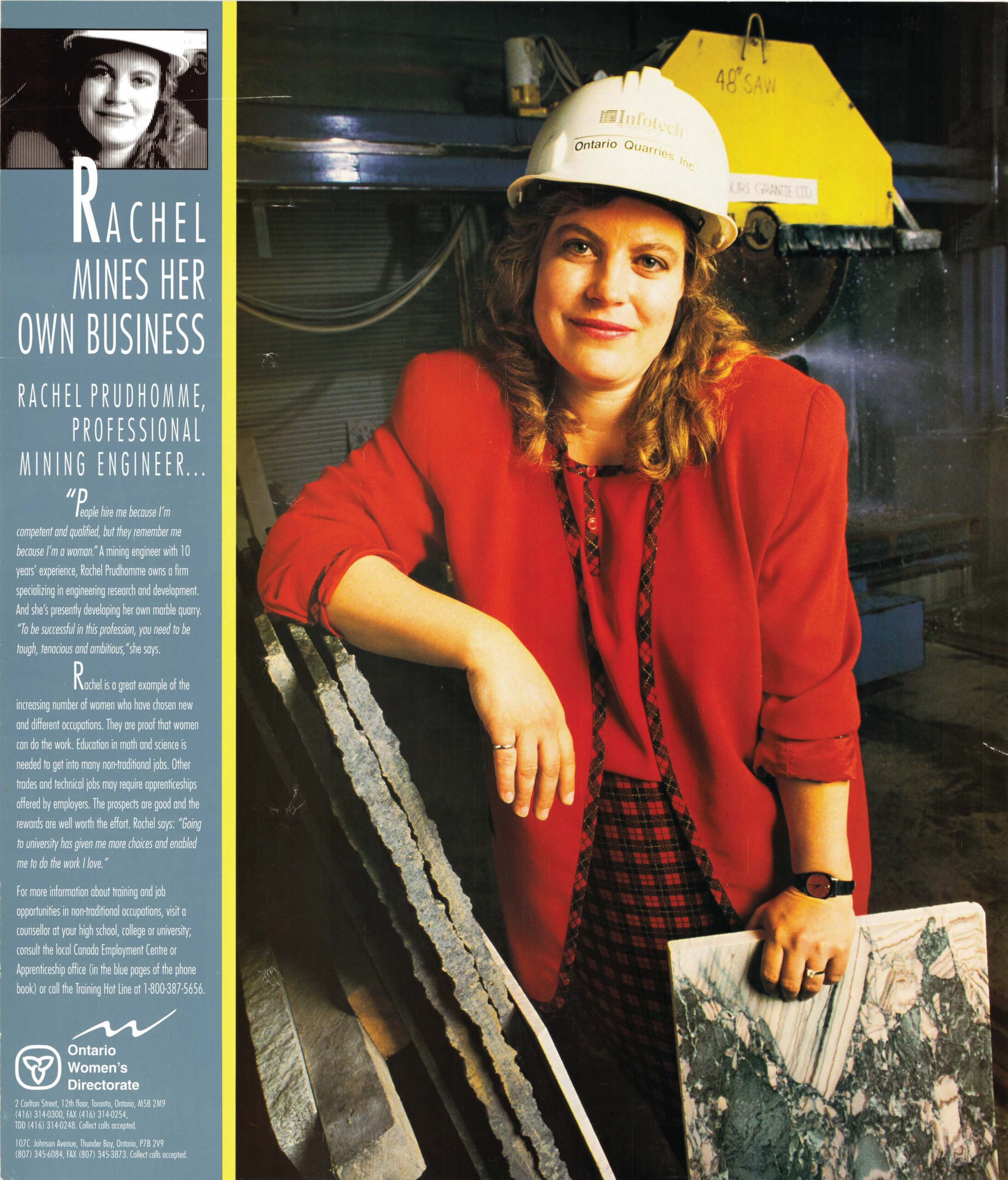 Rachel Mines Her Own Business This poster was created in the early 1990s for the Ontario Women’s Directorate as part of its “Job Opportunities for Women” campaign, which promoted women’s participation in non-traditional occupations during the early 90s. It features Rachel Prudhomme, a professional mining engineer and business owner, highlighting her success in the male-dominated field of mining. The design combines a portrait of Prudhomme in a red suit and safety helmet within an industrial setting, paired with bold typographic storytelling that emphasizes empowerment and perseverance. Graphic design and illustration is by Joss Maclennan; photograph is by Debra Friedman. The poster is one of a number in the Rise Up archival collection by Joss Maclennan. Copyright is held by the artist and the poster is shared here with Joss Maclennan’s permission. Metadata Title: Rachel Mines Her Own Business Region: Ontario Artist: Joss Maclennan