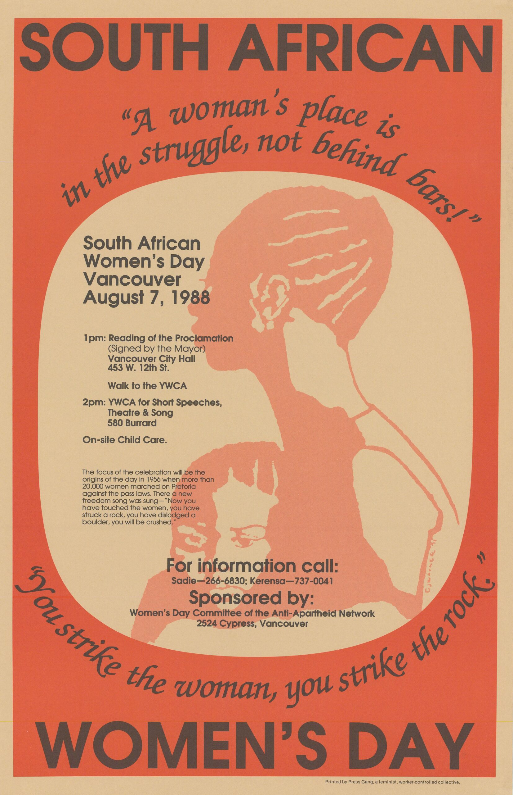 South African Women’s Day 1988 poster promoting a South African Women’s Day event in Vancouver on August 7th, celebrating South African Women’s Day in 1956, when more than 20,000 women marched on Pretoria against the pass laws. The poster features three quotes: “A woman’s place is in the struggle, not behind bars!”; “You strike the woman, you strike the rock”; and “Now you have touched the women, you have struck a rock, you have dislodged a boulder, you will be crushed.”This material is reproduced here with the permission of Press Gang, a feminist printing and publishing collective active in Vancouver from the early 1970s to 2002. Posters by Press Gang are held at the Simon Fraser University Archives. Metadata Title: South African Women’s Day Date: 1988 Region: British Columbia City/Town: Vancouver