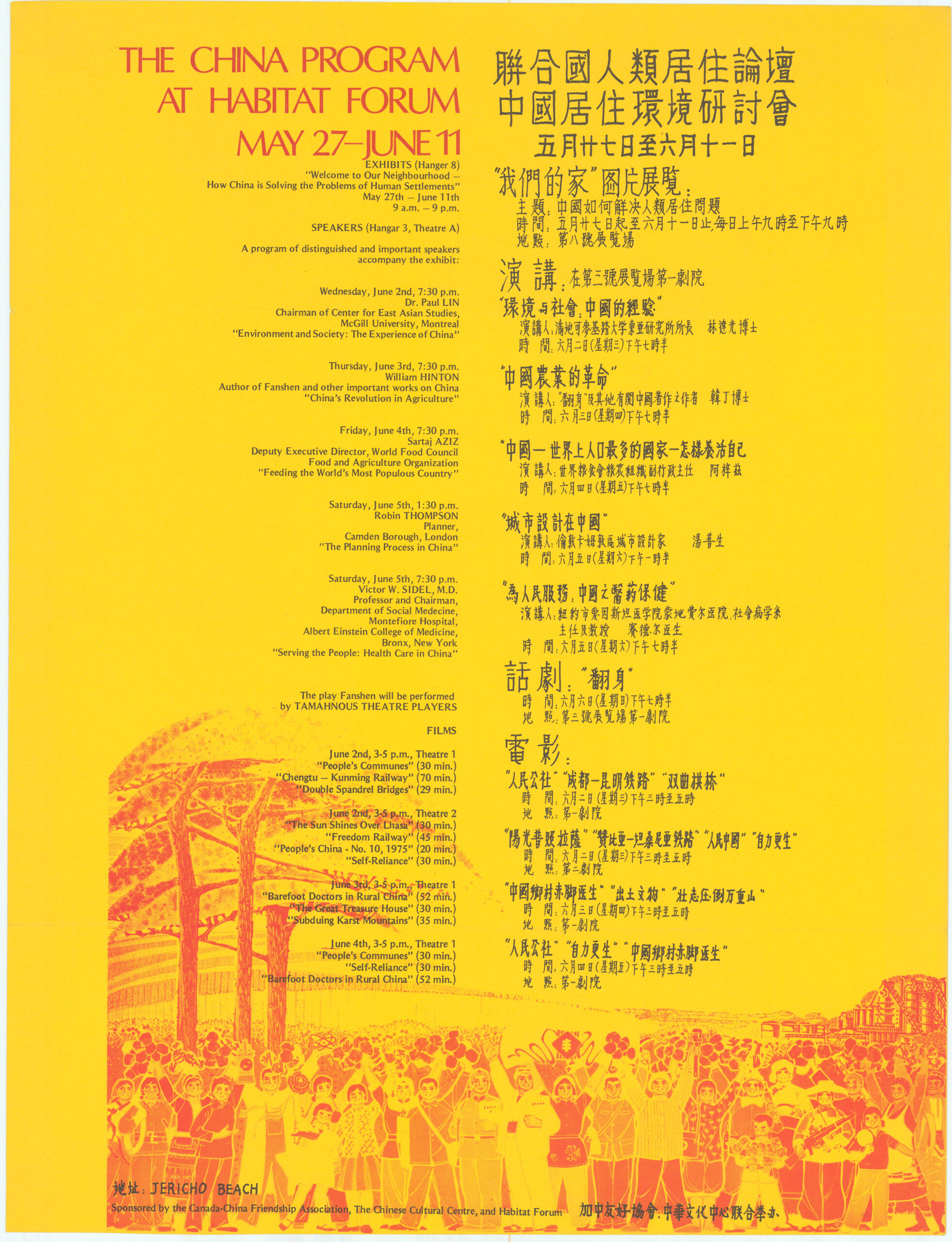 The China Program At Habitat Forum This undated poster highlights The China Program, a series of exhibits, speakers, plays and films representing various topics in relation to China. The events were hosted at the Habitat Forum on the University of British Columbia campus, and were sponsored by the Canada-China Friendship Association, the Chinese Cultural Centre, and Habitat Forum. Event details are also provided in Chinese. This material is reproduced here with the permission of Press Gang, a feminist printing and publishing collective active in Vancouver from the early 1970s to 2002. Posters by Press Gang are held at the Simon Fraser University Archives. Metadata Title: The China Program At Habitat Forum Date: 1976 Region: British Columbia City/Town: Vancouver