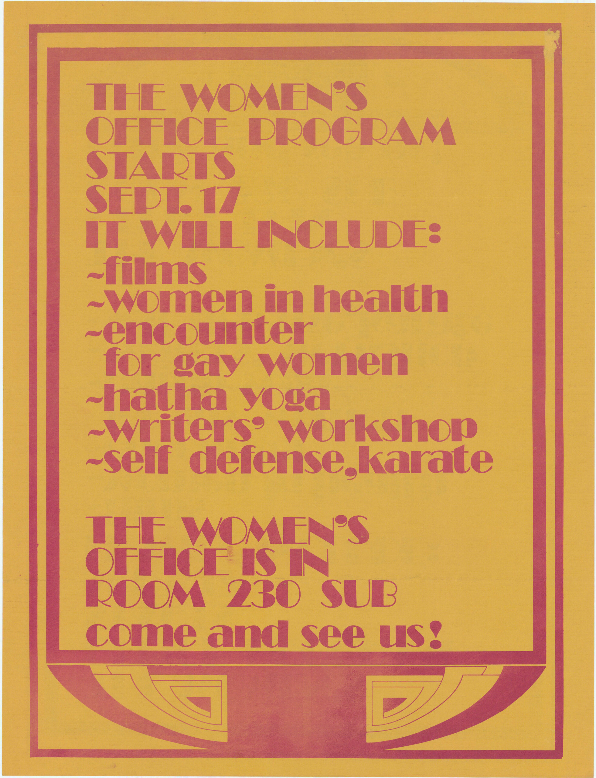 The Women’s Office Program This undated poster, designed by Press Gang, advertises the Women’s Office Collective. The Women’s Office was a student-run community centre at the University of British Columbia (UBC) that brought together various women-focused student and community organizations. The program included films, a women in health panel, gatherings for gay women, yoga, a writer’s workshop, and self defense classes. This is one in a series of posters promoting programming by the Women’s Office. This material is reproduced here with the permission of Press Gang, a feminist printing and publishing collective active in Vancouver from the early 1970s to 2002. Posters by Press Gang are held at the Simon Fraser University Archives. Metadata Title: The Women’s Office Program Region: British Columbia City/Town: Vancouver Artist: Press Gang
