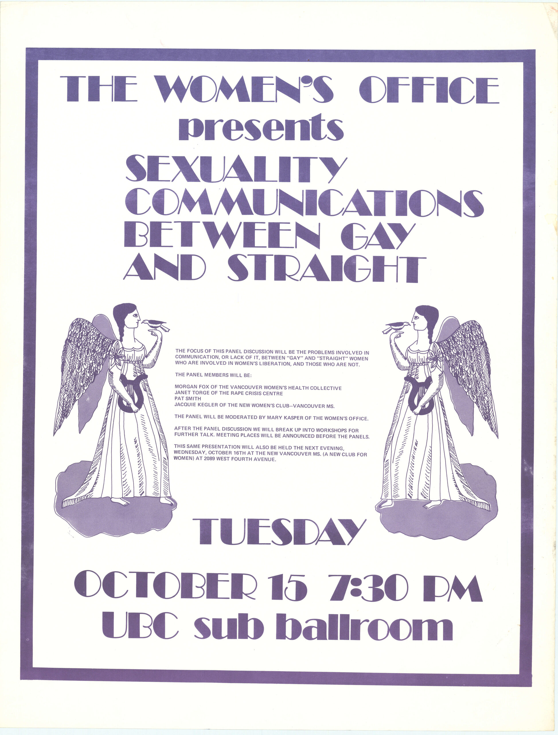 The Women’s Office Sexuality Communications This undated poster, designed by Press Gang, advertises a talk titled “Sexuality Communications Between Gay and Straight,” presented by the Women’s Office, a student-run community centre at the University of British Columbia (UBC). The panel focused on issues surrounding communication between gay and straight women in the women’s liberation movement and beyond. Speakers were Morgan Fox (Vancouver Women’s Health Collective), Janet Torge (Rape Crisis Centre), Pat Smith (Press Gang), and Jacquie Kegler (New Women’s Club–Vancouver Ms). The panel was moderated by Mary Kasper (Women’s Office). This is one in a series of posters promoting programming by the Women’s Office. This material is reproduced here with the permission of Press Gang, a feminist printing and publishing collective active in Vancouver from the early 1970s to 2002. Posters by Press Gang are held at the Simon Fraser University Archives. Metadata Title: The Women’s Office Sexuality Communications Region: British Columbia City/Town: Vancouver Artist: Press Gang