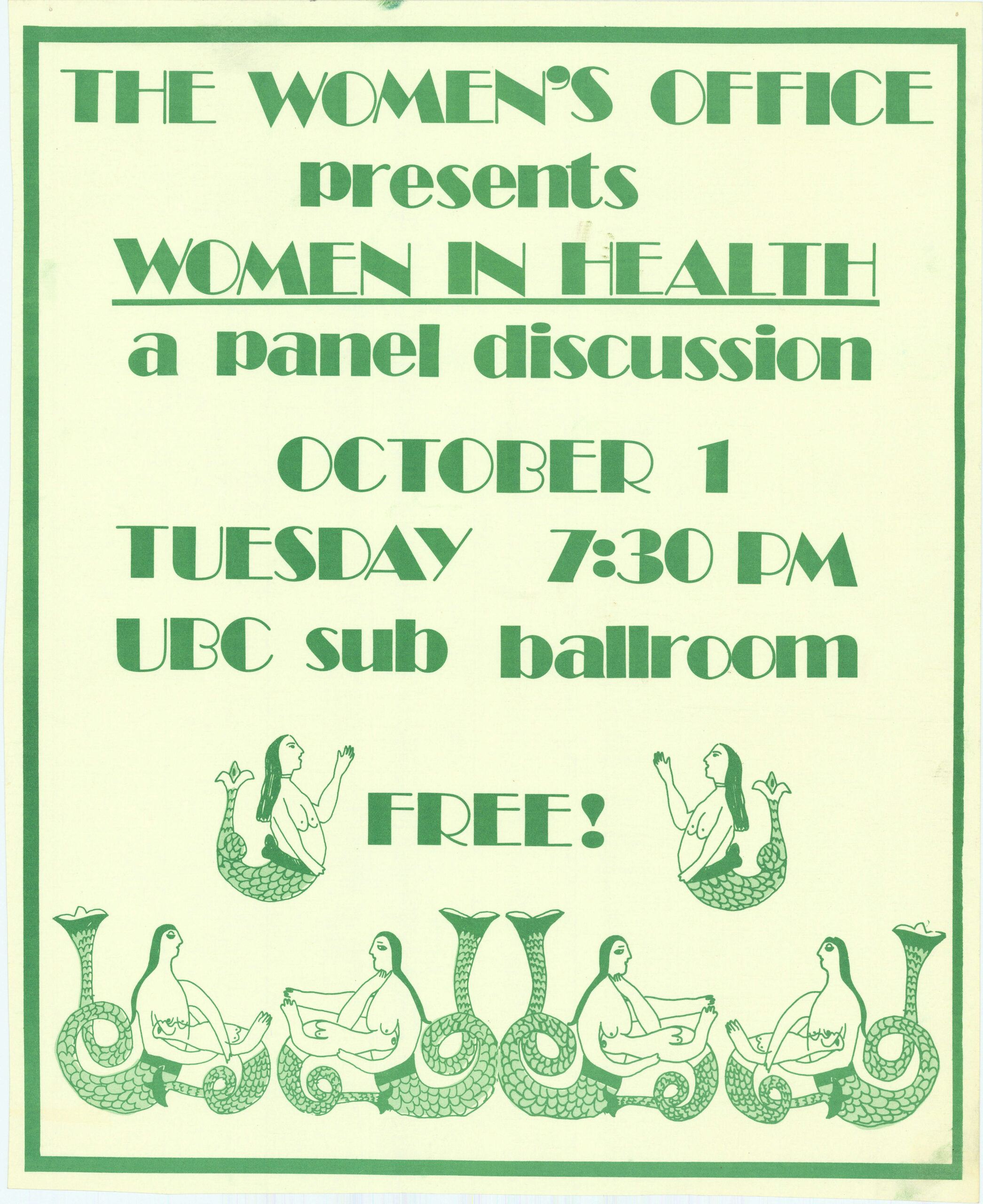 The Women’s Office: Women in Health This undated poster, designed by Press Gang, promotes a free panel discussion titled Women in Health, organized by the Women’s Office Collective at the University of British Columbia (UBC). The Women’s Office was a student-run community centre at UBC that brought together various women-focused student and community organizations. This is one in a series of posters promoting programming by the Women’s Office. This material is reproduced here with the permission of Press Gang, a feminist printing and publishing collective active in Vancouver from the early 1970s to 2002. Posters by Press Gang are held at the Simon Fraser University Archives. Metadata Title: The Women’s Office: Women in Health Region: British Columbia City/Town: Vancouver Artist: Press Gang