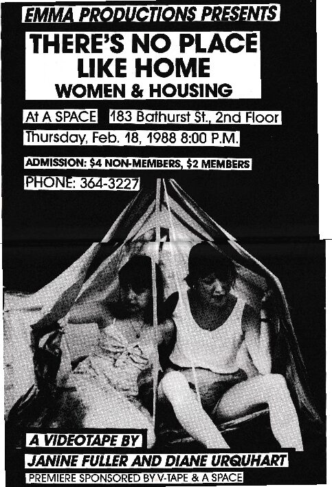 There’s No Place Like Home This 1988 poster promotes the Toronto screening of “There’s No Place Like Home – Women and Housing”, a videotape by Janine Fuller and Diane Urquhart, and presented by Emma Productions at A-Space. This is one of several posters in the Rise Up archival collection related to film and performance work by Marusya Bociurkiw. They are available on the Rise Up website with her permission. Metadata Title: There’s No Place Like Home Date: 1988 Region: Ontario City/Town: Toronto