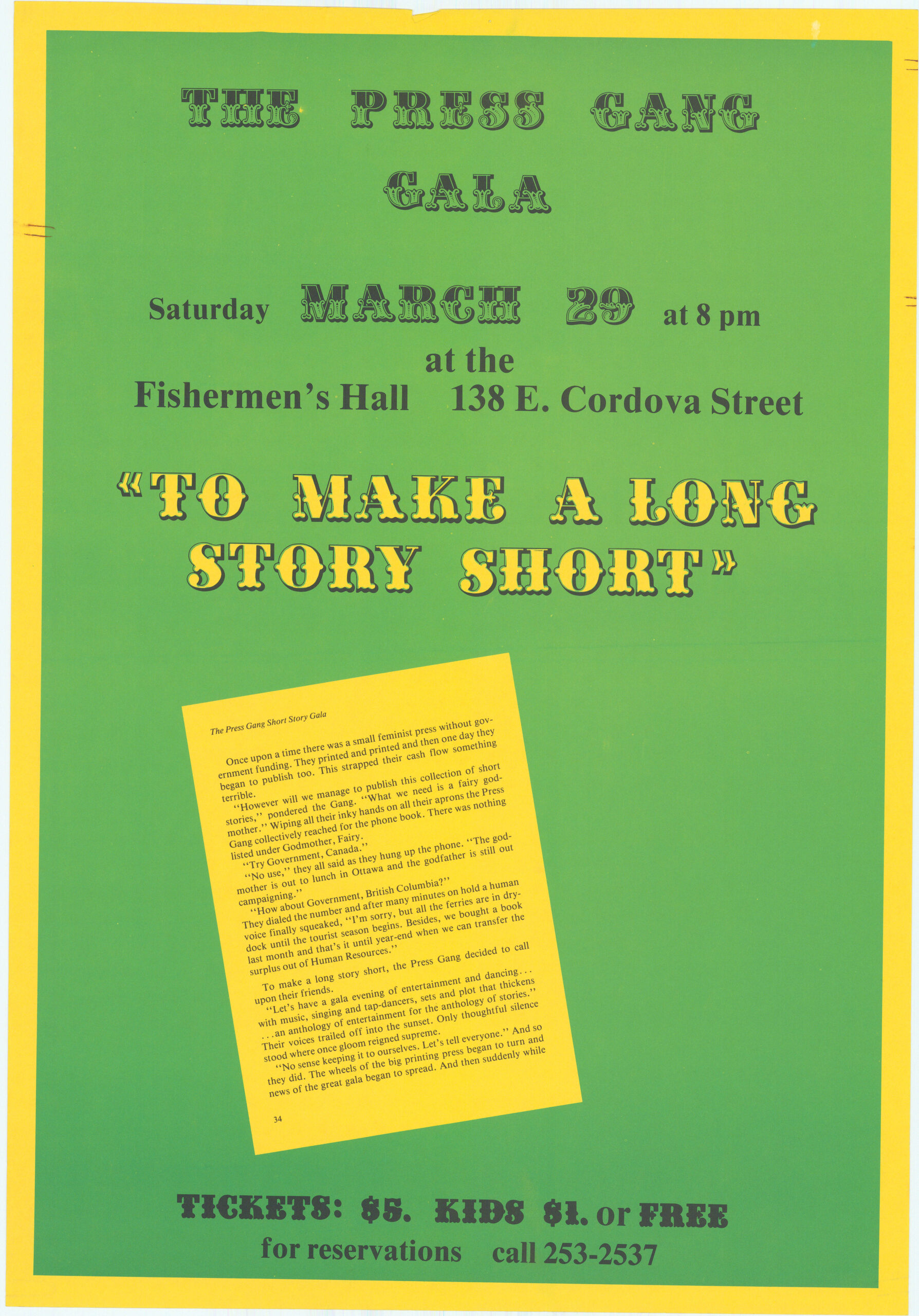 “To Make a Long Story Short” – The Press Gang Gala Undated poster promoting The Press Gang Gala, held at Fisherman’s Hall. At the center, a yellow page features a short story explaining how the dance began as a fundraising initiative for the organization. The evening included music, singing, tap dancers, and set performances, described by organizers as an “anthology of entertainment.” This material is reproduced here with the permission of Press Gang, a feminist printing and publishing collective active in Vancouver from the early 1970s to 2002. Posters by Press Gang are held at the Simon Fraser University Archives. Metadata Title: “To Make a Long Story Short” – The Press Gang Gala Region: British Columbia City/Town: Vancouver