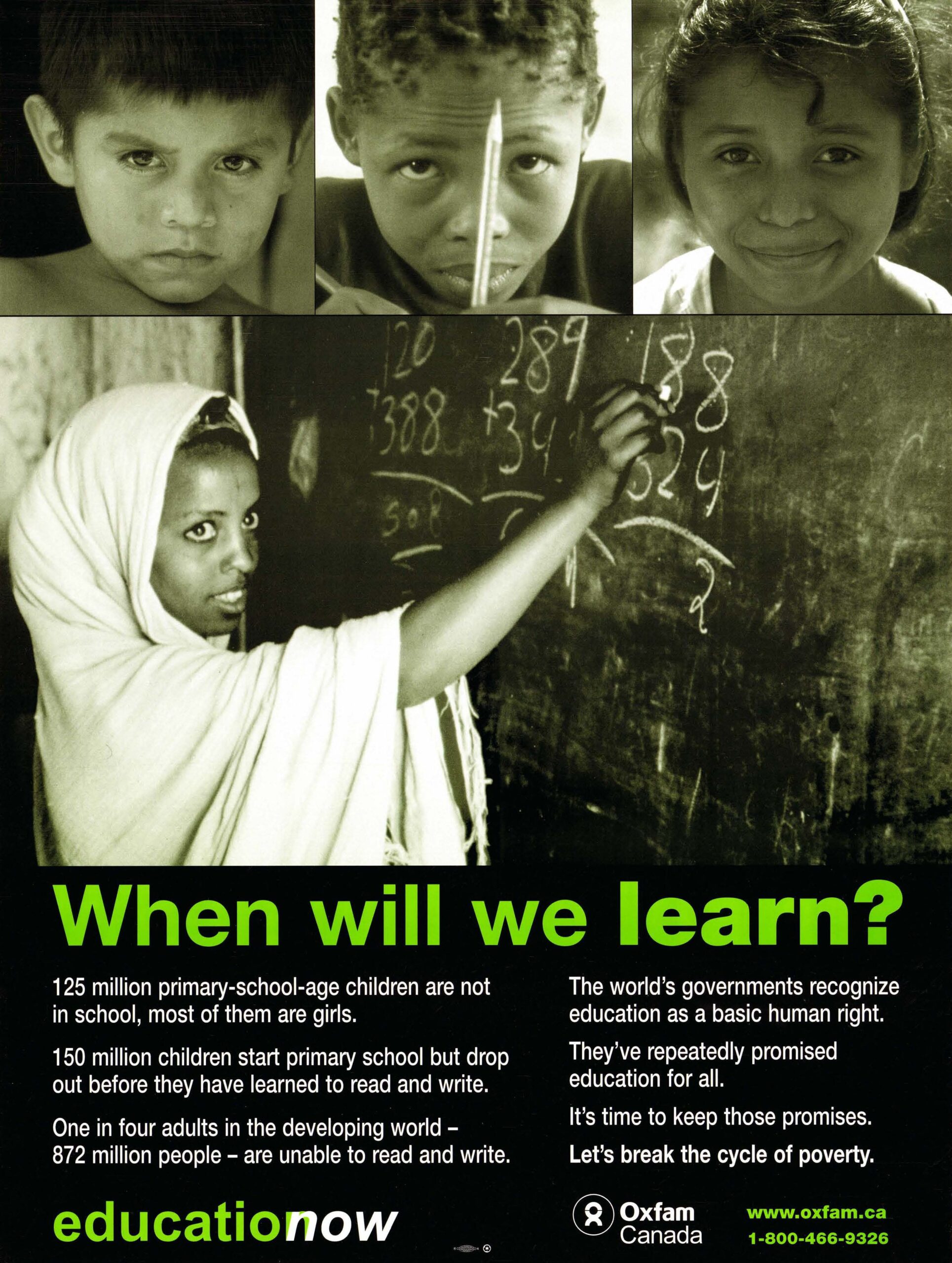 When Will We Learn? This poster was created in the 1990s for the Oxfam Canada campaign educationow which was aimed at informing the public about adversities faced by children, and particularly girls, globally in their pursuit of education while also battling poverty. The design uses white and lime text on a black background with a header of black and white photos of young, diverse children in schools and the tagline reads “When will we learn?”. The poster features a website and a help-line to connect viewers with resources. Graphic design is by Joss Maclennan. The poster is one of a number in the Rise Up archival collection by Joss Maclennan. Copyright is held by the artist and the poster is shared here with Joss Maclennan’s permission. Metadata Title: When Will We Learn? Region: National (all of Canada) Artist: Joss Maclennan
