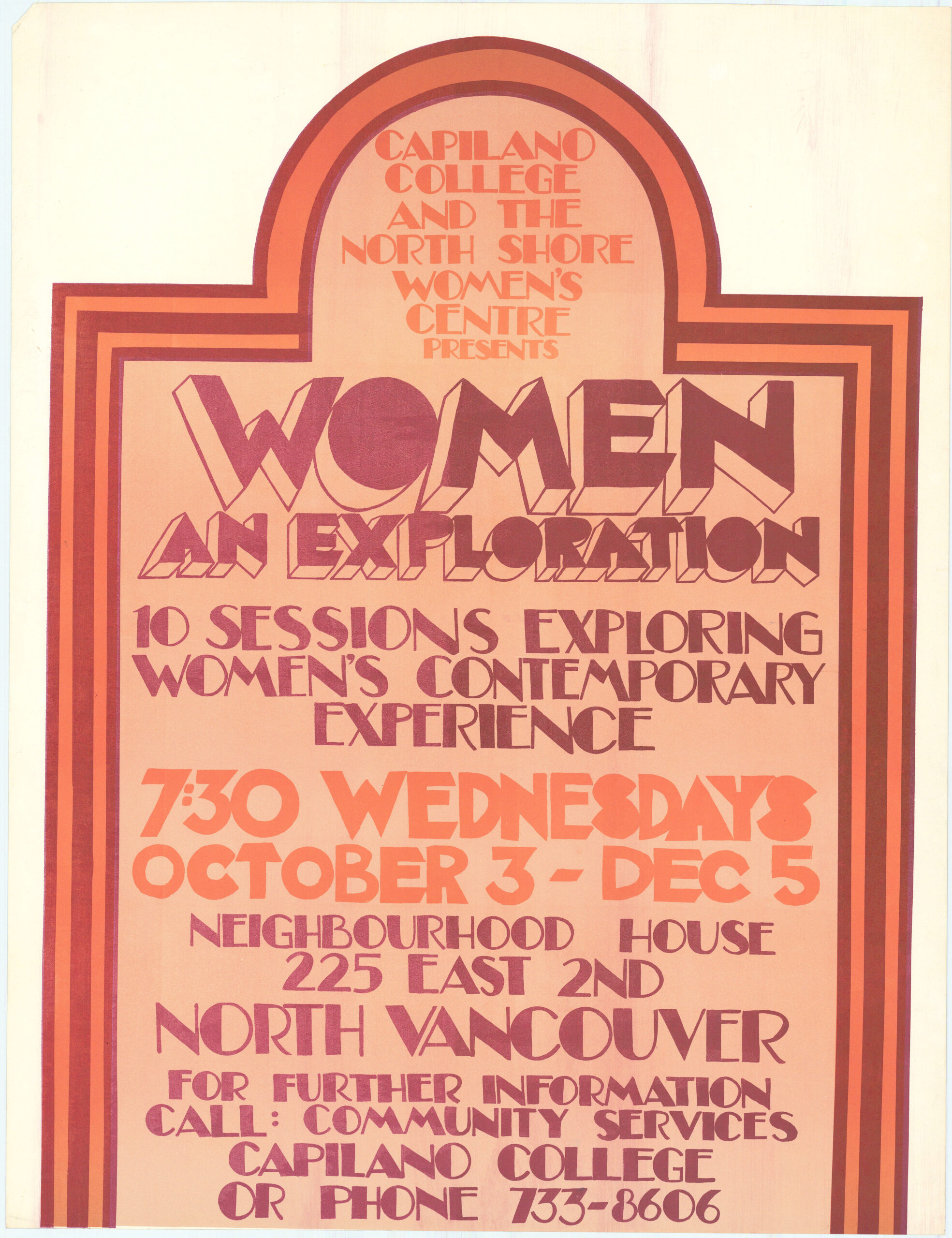 Women: An Exploration This undated poster promotes Women: An Exploration – 10 sessions exploring women’s contemporary experiences. The sessions were presented by the North Shore Women’s Centre and Capilao College at the Neighbourhood House in North Vancouver. This material is reproduced here with the permission of Press Gang, a feminist printing and publishing collective active in Vancouver from the early 1970s to 2002. Posters by Press Gang are held at the Simon Fraser University Archives. Metadata Title: Women: An Exploration Region: British Columbia City/Town: North Vancouver Artist: Press Gang