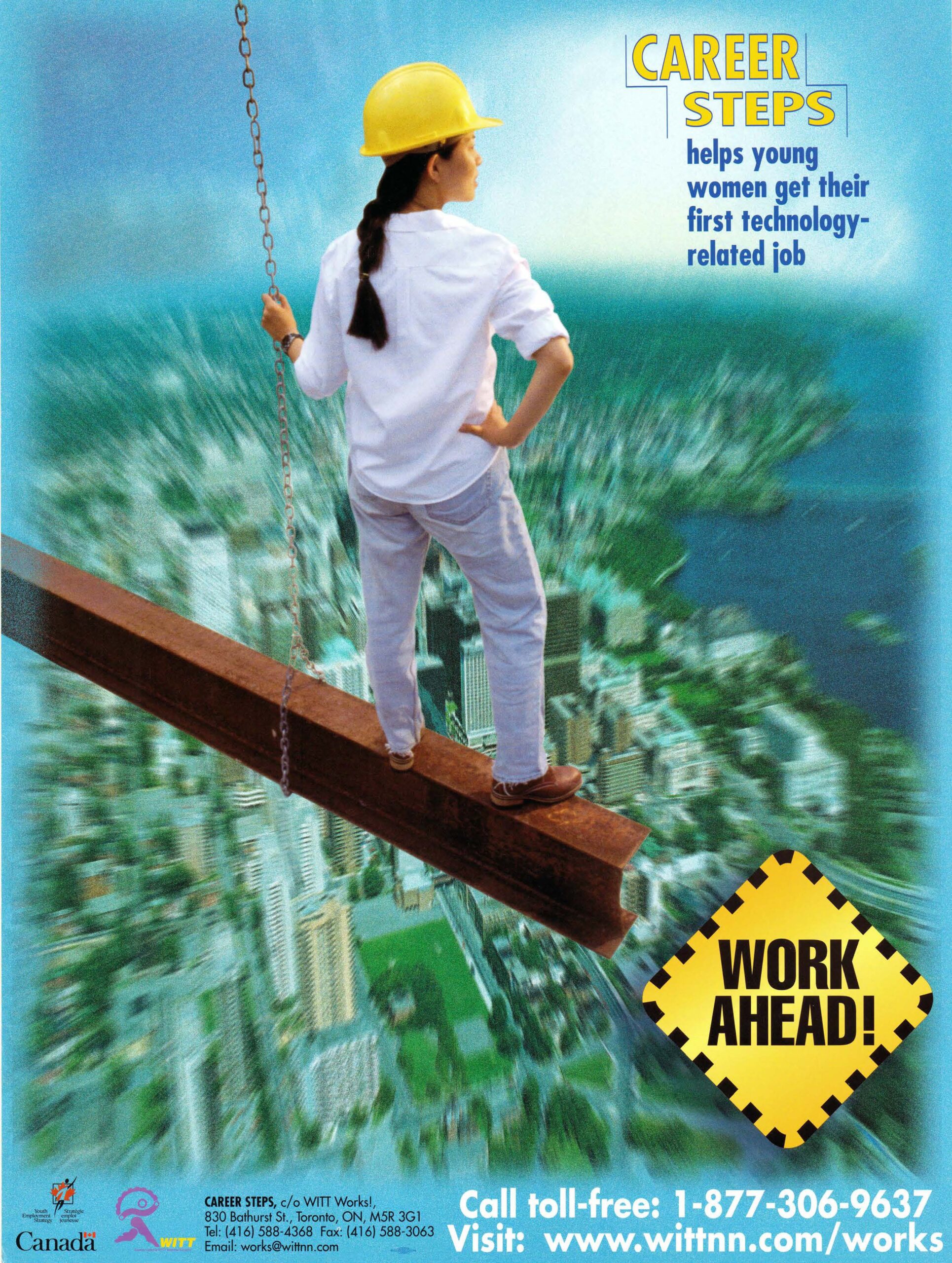 Work Ahead – Career Steps helps young women get their first technology-related job This undated poster was created in the early 1990s for the promotion of “Career Steps”, a program to prepare women to join the WITT (Women in Technology & Trades) fields. The program was sponsored by the federal government of Canada through the Youth Employment Strategy program. The graphic features a woman in white, plain clothes with a yellow hardhat, standing on a beam while being lifted into the sky above the city. The design uses multicoloured texts in yellow, navy, black and white in contrast to the blue skyline. Graphic design is by Joss Maclennan. The poster is one of a number in the Rise Up archival collection by Joss Maclennan. Copyright is held by the artist and the poster is shared here with Joss Maclennan’s permission. Metadata Title: Work Ahead – Career Steps helps young women get their first technology-related job Region: National (all of Canada) Artist: Joss Maclennan